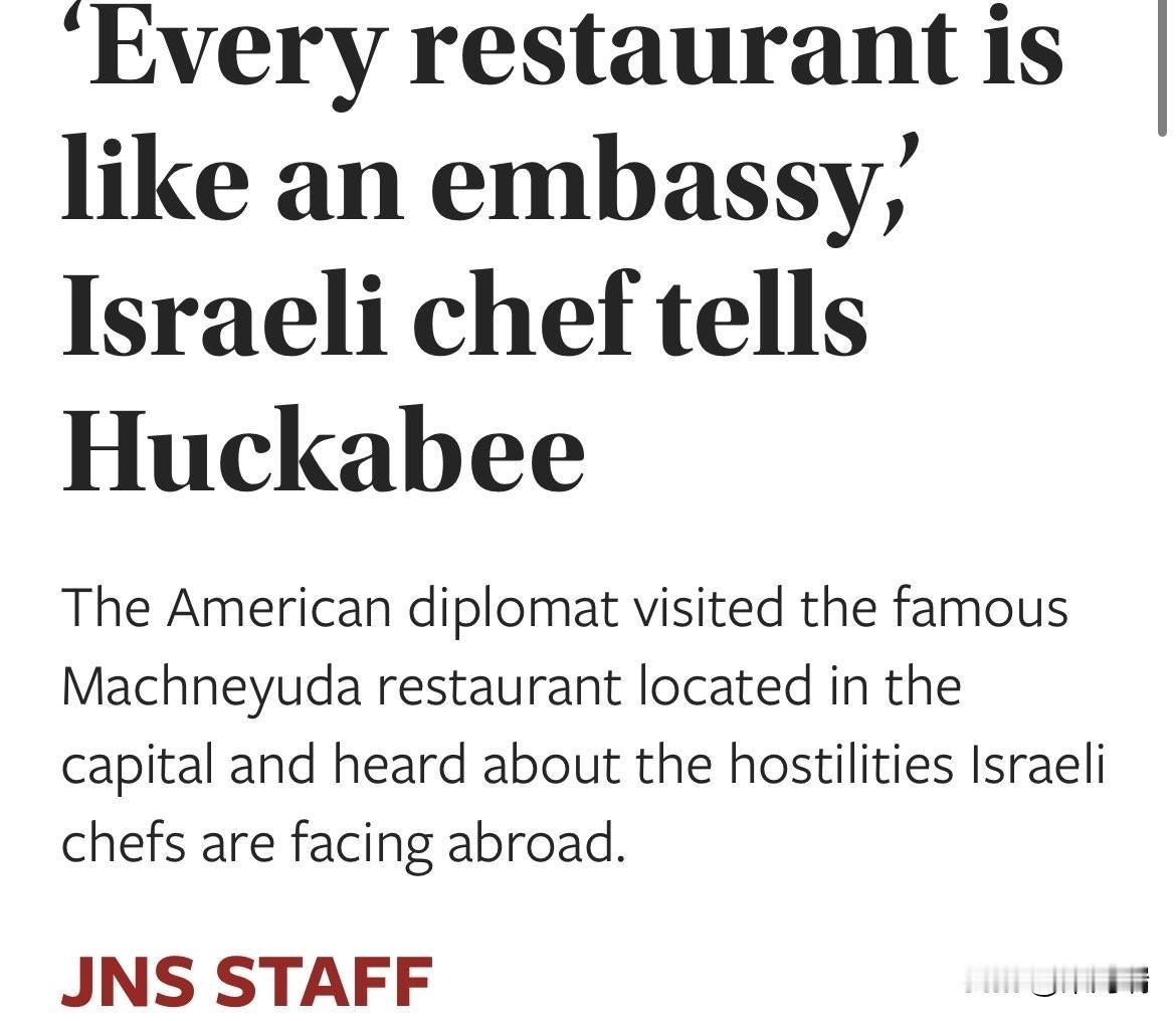 美国驻以色列大使迈克·赫卡比最近在耶路撒冷的Machneyuda餐厅与以色列著名厨师阿萨夫·格拉尼特坐下来,谈论以色列美食、首都的多元力量以及以色列厨师现在面临的日益增长的反以色列情绪所带来的困难。 “生活在耶路撒冷是一种福气,这里古老与现代交融,传统推动着创新,”这位美国外交官周三在推特上写道。 哈克比发布了一段他在餐厅与格兰尼特聊天的视频,这家餐厅以其充满活力的氛围和每日更换的菜单而闻名。 “对于世界各地的以色列厨师来说,现在是一个非常棘手的时期,”格拉尼特告诉哈克比,他还在伦敦、巴黎和加勒比海的圣巴泰勒米岛经营餐厅。 “我们的招牌菜一直是以色列菜,也是我们赖以成名的菜系。但现在它却招致了很多憎恨和批评,”这位厨师继续说道。 “食物是最好的沟通方式。每家餐厅都几乎像一个大使馆,”他补充道。 “哇,我从没想过大使馆会像厨房一样……我希望我们能让更多的人开心,”哈克比回答道。 现任美国驻以色列大使是迈克·赫卡比 (Mike Huckabee)。他于2025年4月9日获得美国参议院确认,并于同年就任。 赫卡比此前曾担任阿肯色州州长,并两次竞选美国总统。他是一位坚定的以色列支持者。