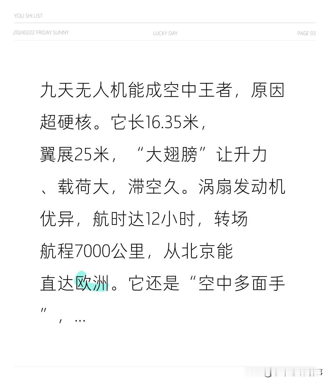 九天无人机称霸空中,原因十分硬核。它长16.35米,翼展25米,宽大机翼带来大升力与高载荷,滞空时间长。涡扇发动机性能优异,航时12小时,转场航程7000公里,可从北京直飞欧洲。 它是“空中多面手”,6吨载荷换装灵活,能为山区海岛送物资,执行抢险、测绘等任务。军事上表现出色,2小时快速切换任务,挂电子战吊舱可干扰敌方。异构蜂巢任务仓能携上百架小型无人机,成本低,称王实至名归!
