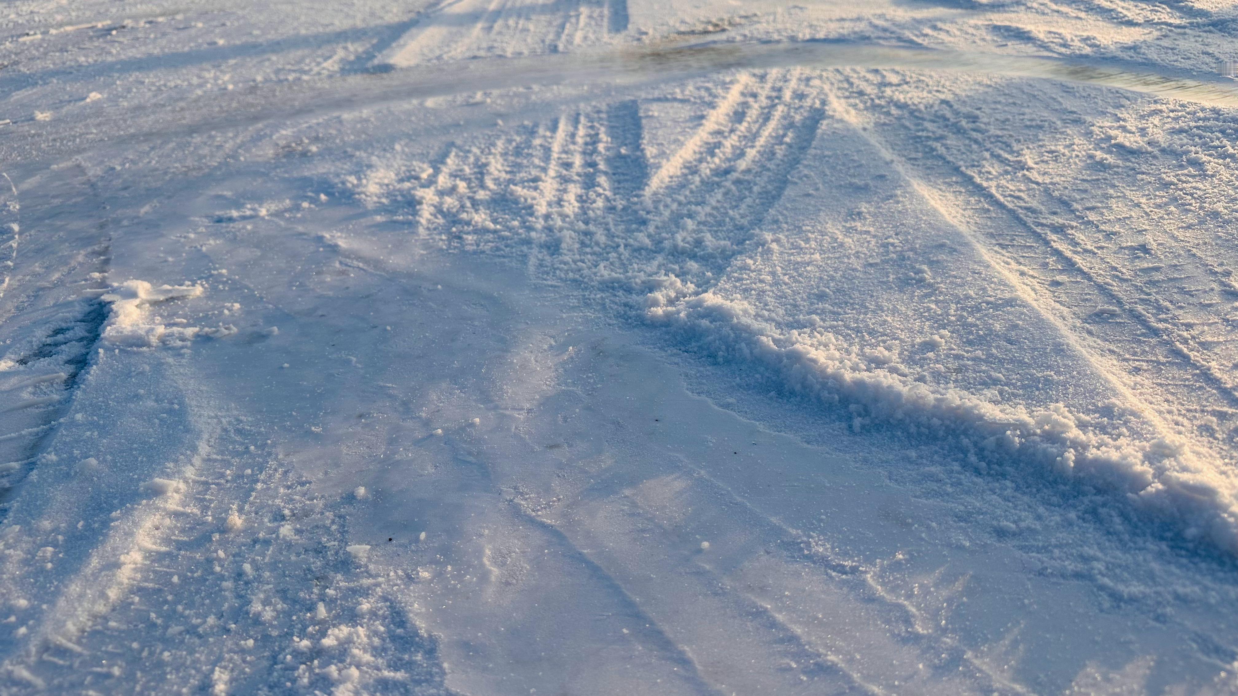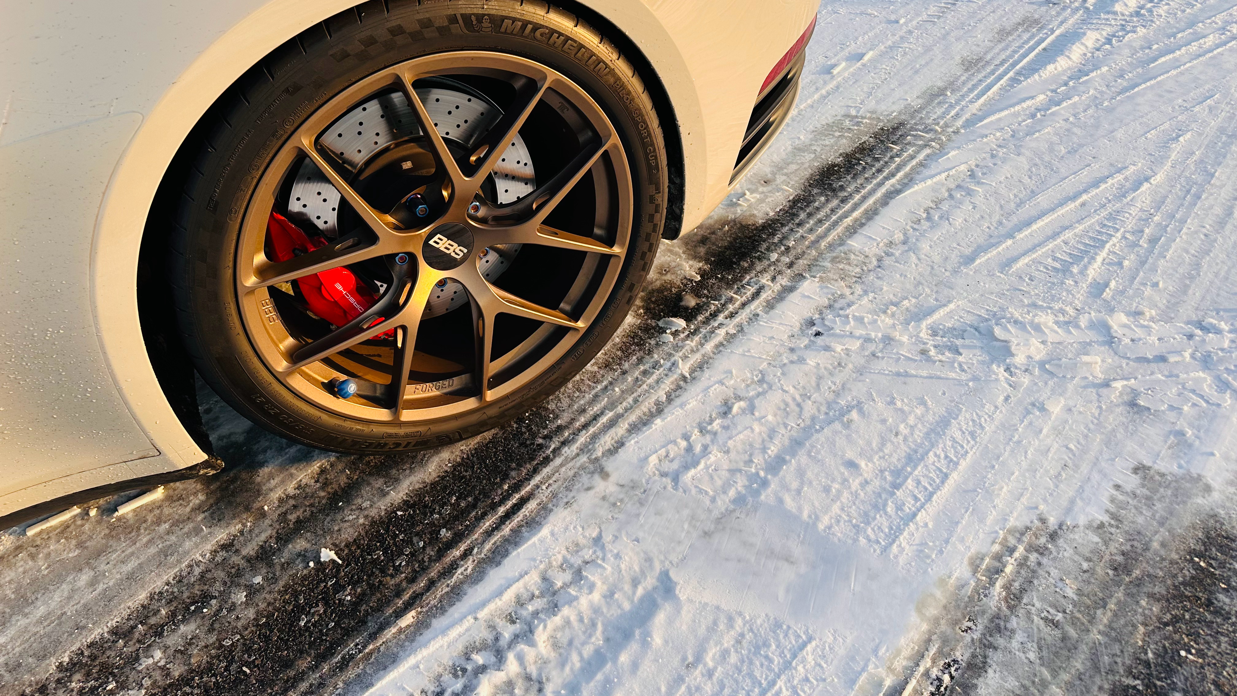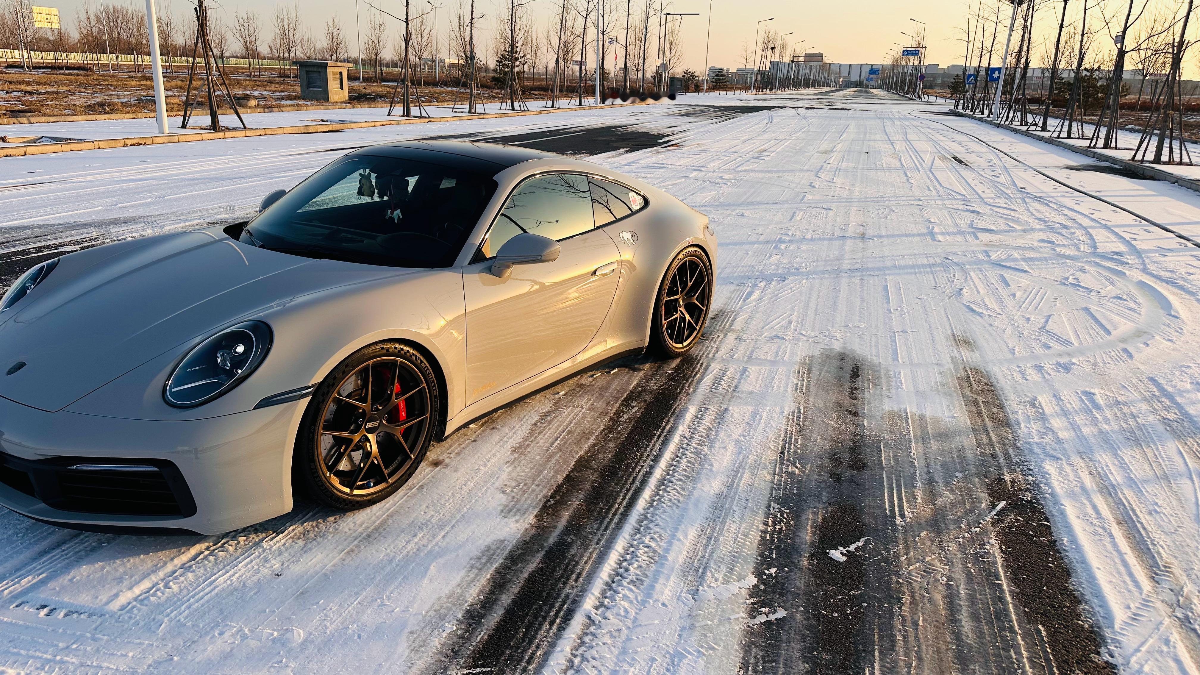 给你们看看 CUP 2 在雪地上的表现。这个平滑如镜的胎纹是 CUP 2 挠出来的,旁边是正常夏季胎的胎纹。CUP 2 在这个地面下,别说漂移了, 前轮都不剩什么了。别不正经说车保时捷保时捷