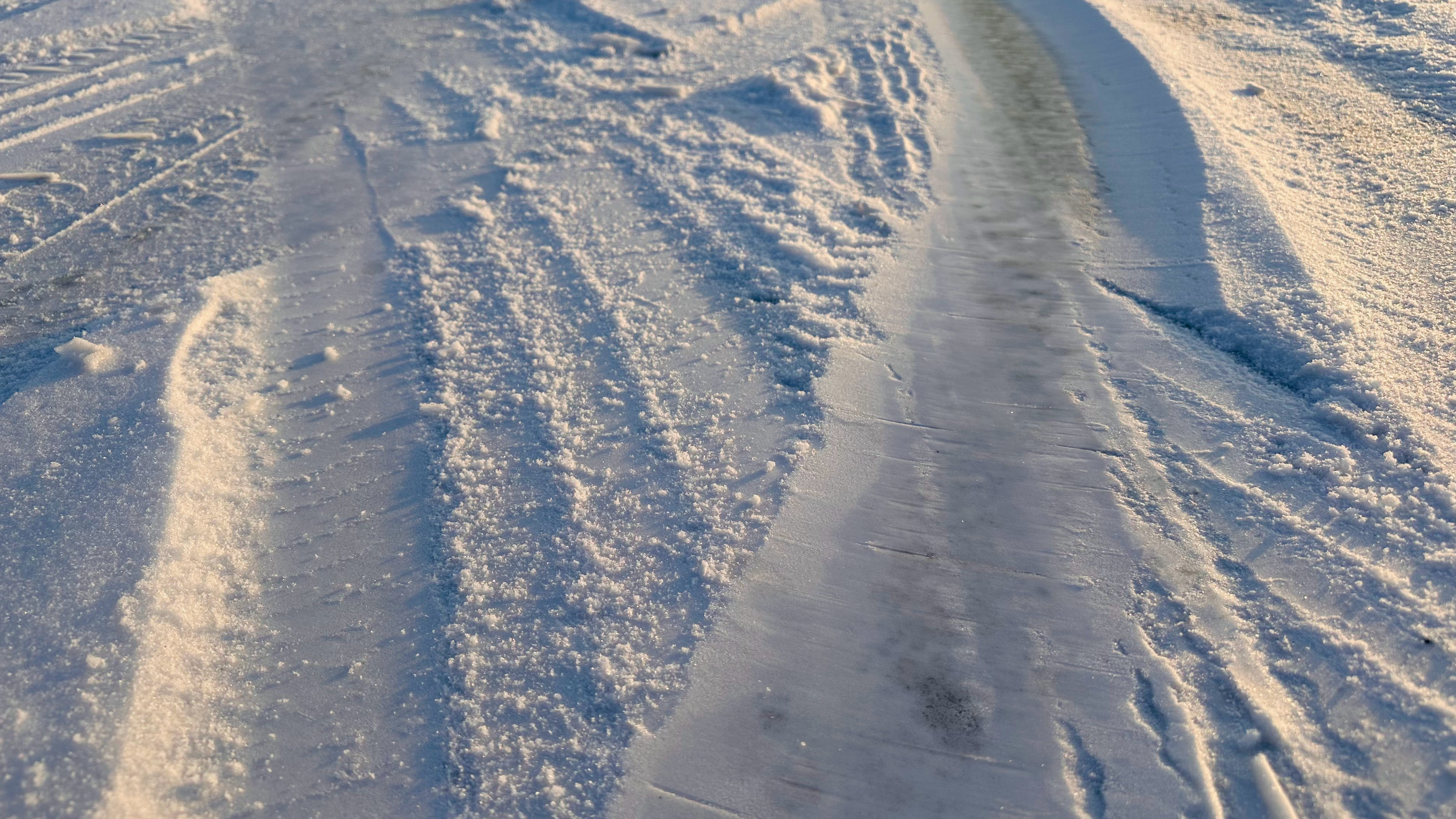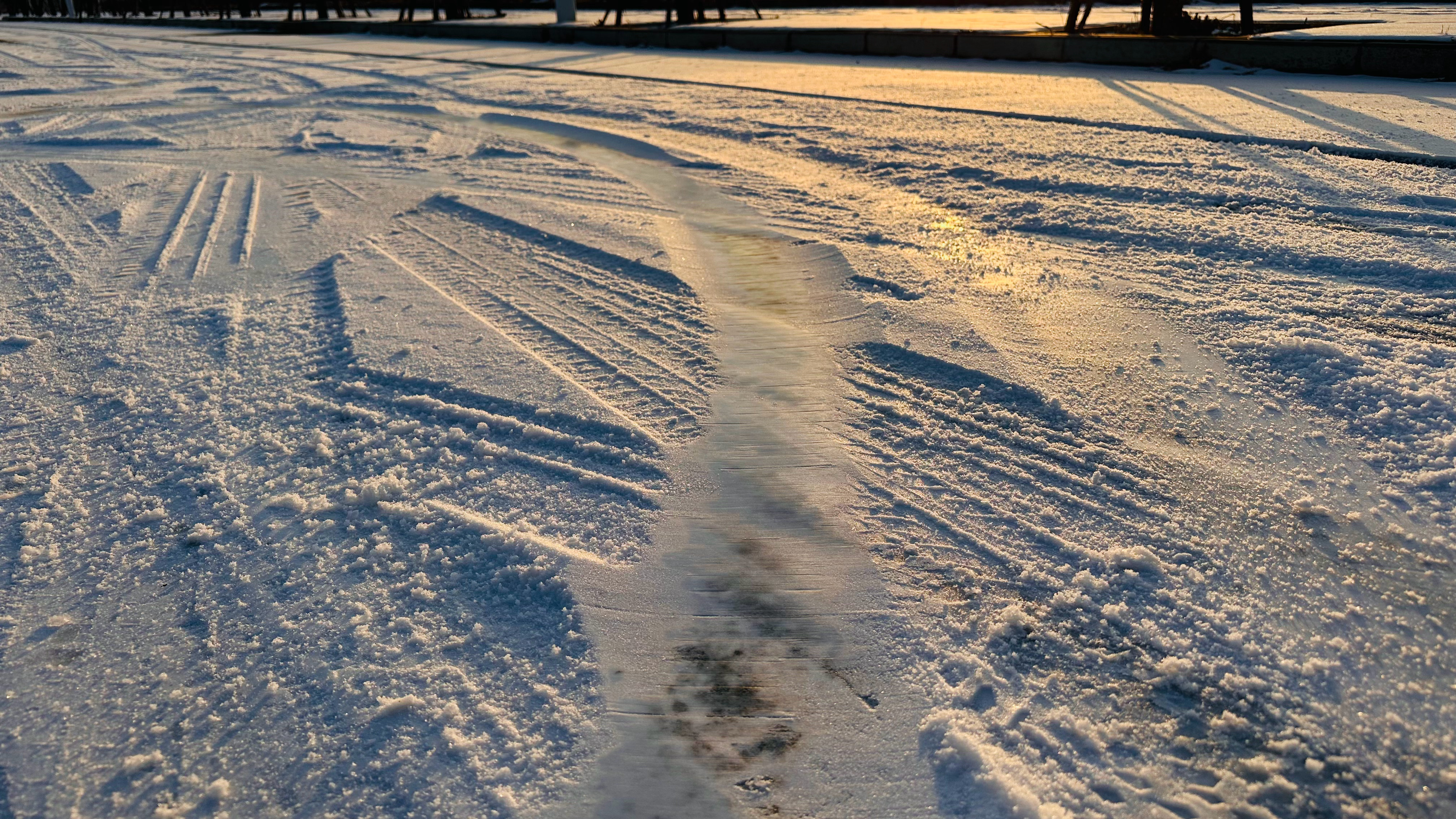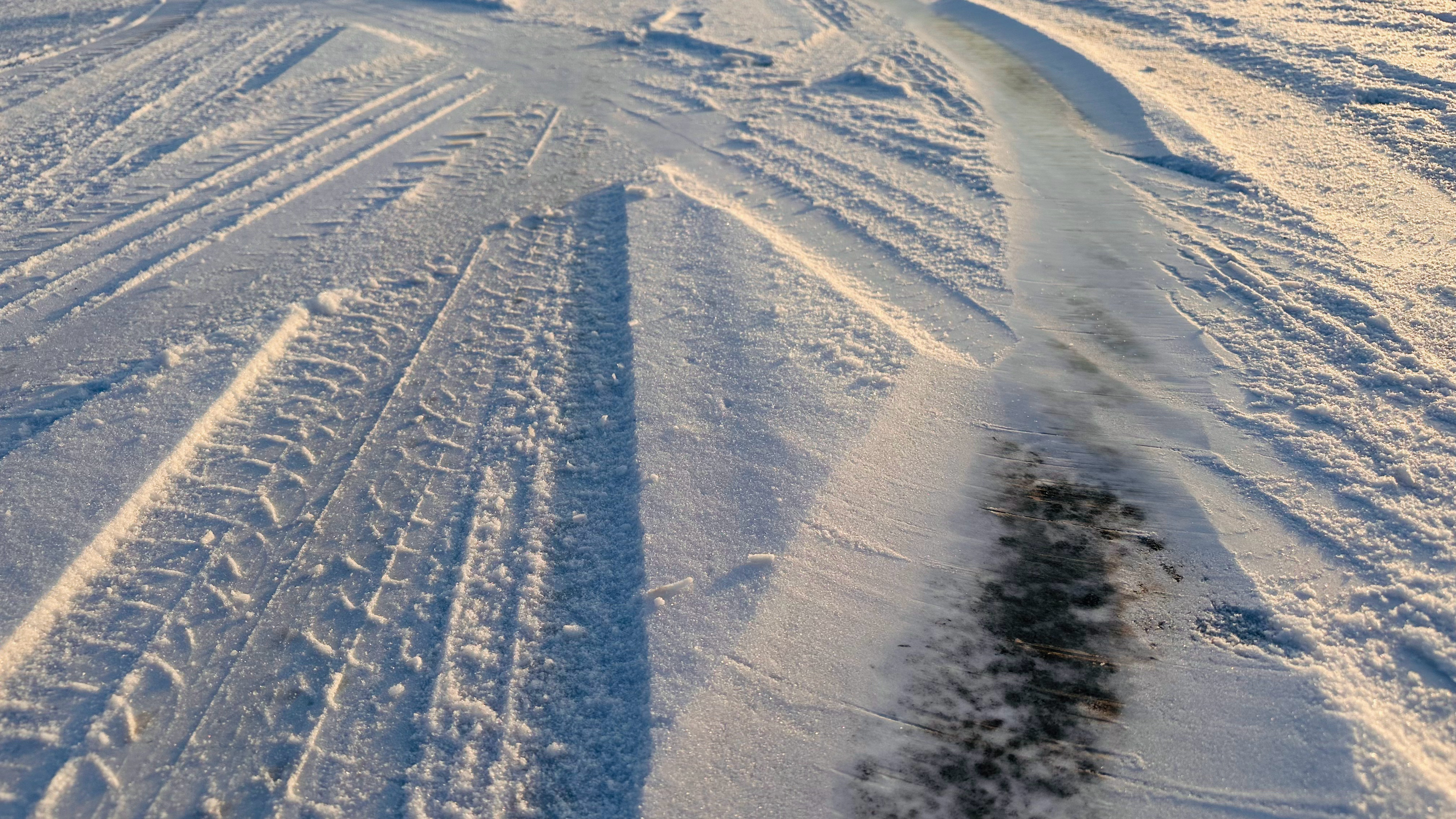给你们看看 CUP 2 在雪地上的表现。这个平滑如镜的胎纹是 CUP 2 挠出来的,旁边是正常夏季胎的胎纹。CUP 2 在这个地面下,别说漂移了, 前轮都不剩什么了。别不正经说车保时捷保时捷