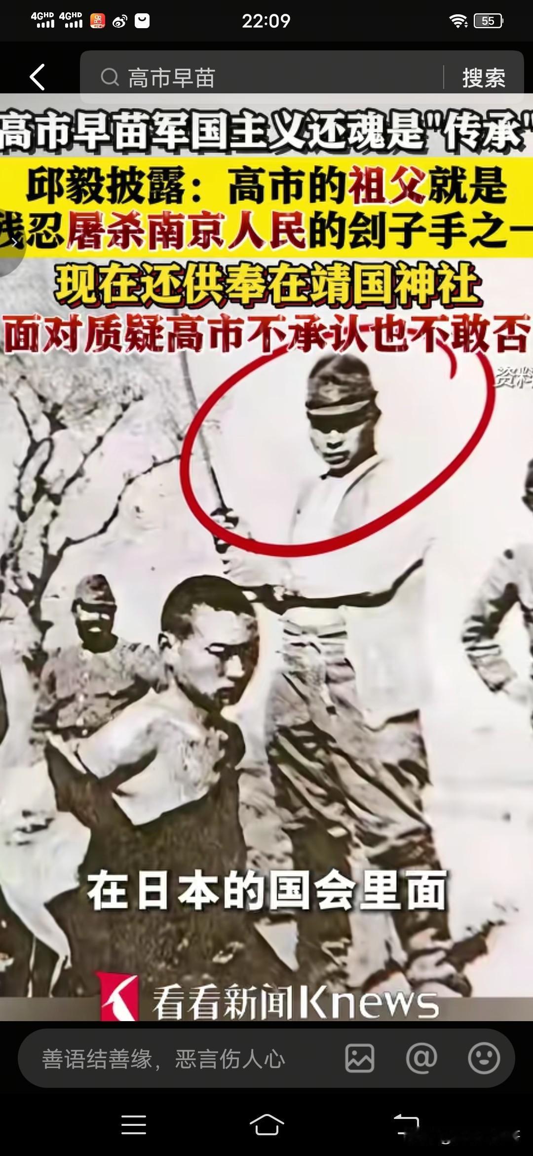 12月13日,台湾学者邱毅爆料高市早苗的祖父是南京大屠杀刽子手,名字叫高市利彦,是陆军少佐,现在供奉在靖国神社 ! 这个消息太震撼了,原来高市早苗就是南京大屠杀刽子手首高市利彦的孙女,高市早苗就是全体中国人民的仇敌 , 高市家族算得上是祖上流脓下辈生疮,坏透了底 ! 发现了没有 , 侵华战争的首要军国主义分子战败以后没有被清算,回到日本后他们的后代仍然是狂热的军国主义分子。除了这个高市利彦,还有一个名叫岸信介的刽子手, 他的后代仍然是狂热的军国主义分子 。 岸信介, 侵华战争甲级战犯之一, 回日本后 ,还担任日本56、57任首相,他的 外甥就是安倍晋三。 高市早苗是安倍右翼议程的忠实继承者和激进推进者 , 高市进入内阁,就是安倍提拔进去的 。 安倍这个军国主义狂热分子早已进了坟墓 , 现在高市又想让军国主义幽灵再现, 中国人民的大刀早就准备好,伸头必砍!
