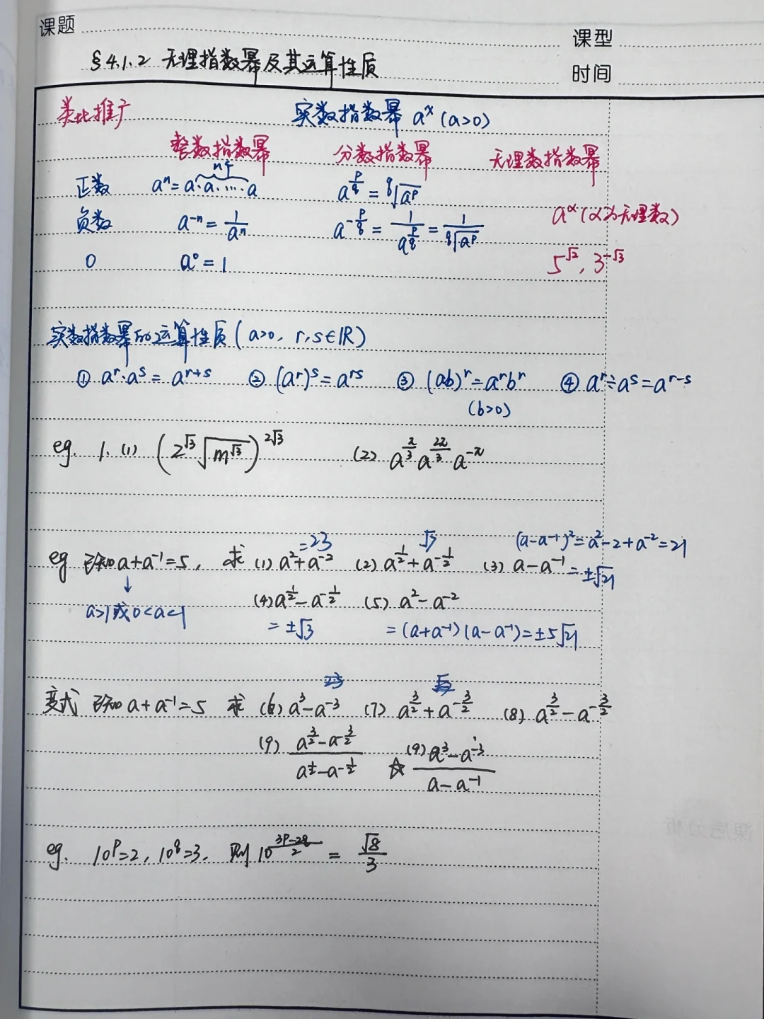 两个课时的内容,相对比较容易的一节,特别是学生有了初中学习的基础,学起来会比较轻松,重在计算。这一节起了承上启下的作用,为之后学习指数函数做铺垫。