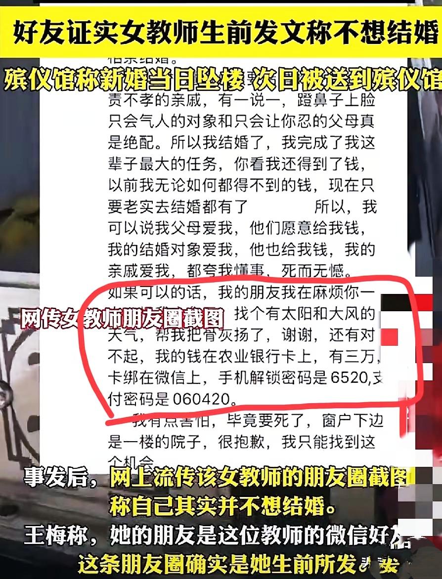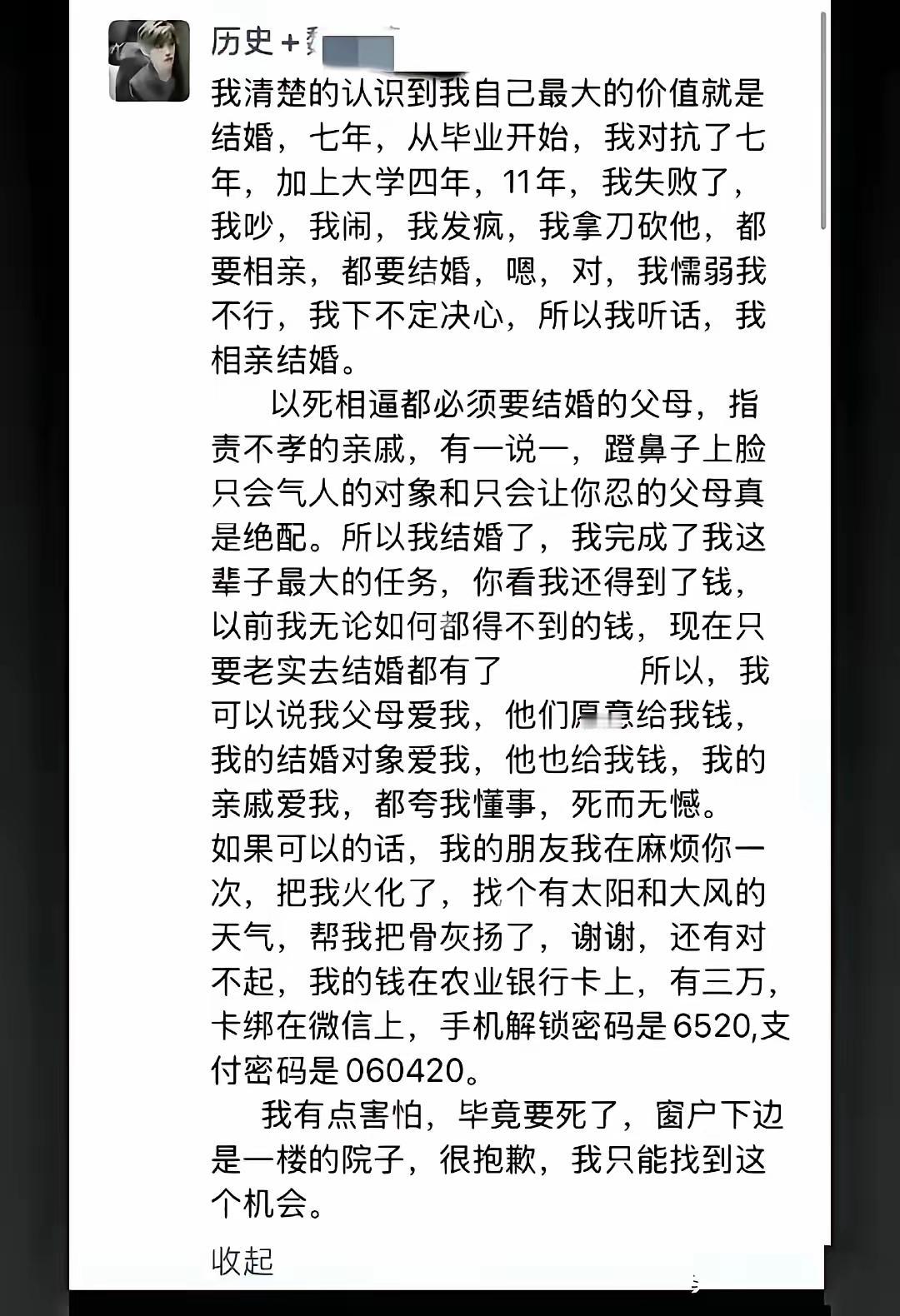 河南鲁山这位姑娘,留下的最后一句话,不是怨恨,而是道歉! 河南鲁山这位姑娘,是学生眼里温柔的好老师,却在家人的不结婚就断生活费逼迫下,硬着头皮走进一场毫无感情的婚礼。婚礼刚办完,人就没了。更寒心的是,男方家第一反应竟是退彩礼,好像这场婚姻,从头到尾只是一笔交易。 这正是很多中国父母可悲的地方:你们真的了解自己的孩子吗?我身边太多父母总说我都是为你好,可孩子真正需要什么?我一个朋友的女儿,就因为受不了这种关心,一个人逃到上海,再也不敢回家。 其实很多人不是不想爱,而是恐惧和一个无法产生联结的人共度一生——那种日复一日的窒息感,生不如死。人与人之间,哪怕是亲生父母,也不能强求、更不该道德绑架。每个人都是独立的生命,有自己的节奏和宿命。强行干涉,看似成全了面子,实则毁了人生,难为了孩子,最终也苦了自己。