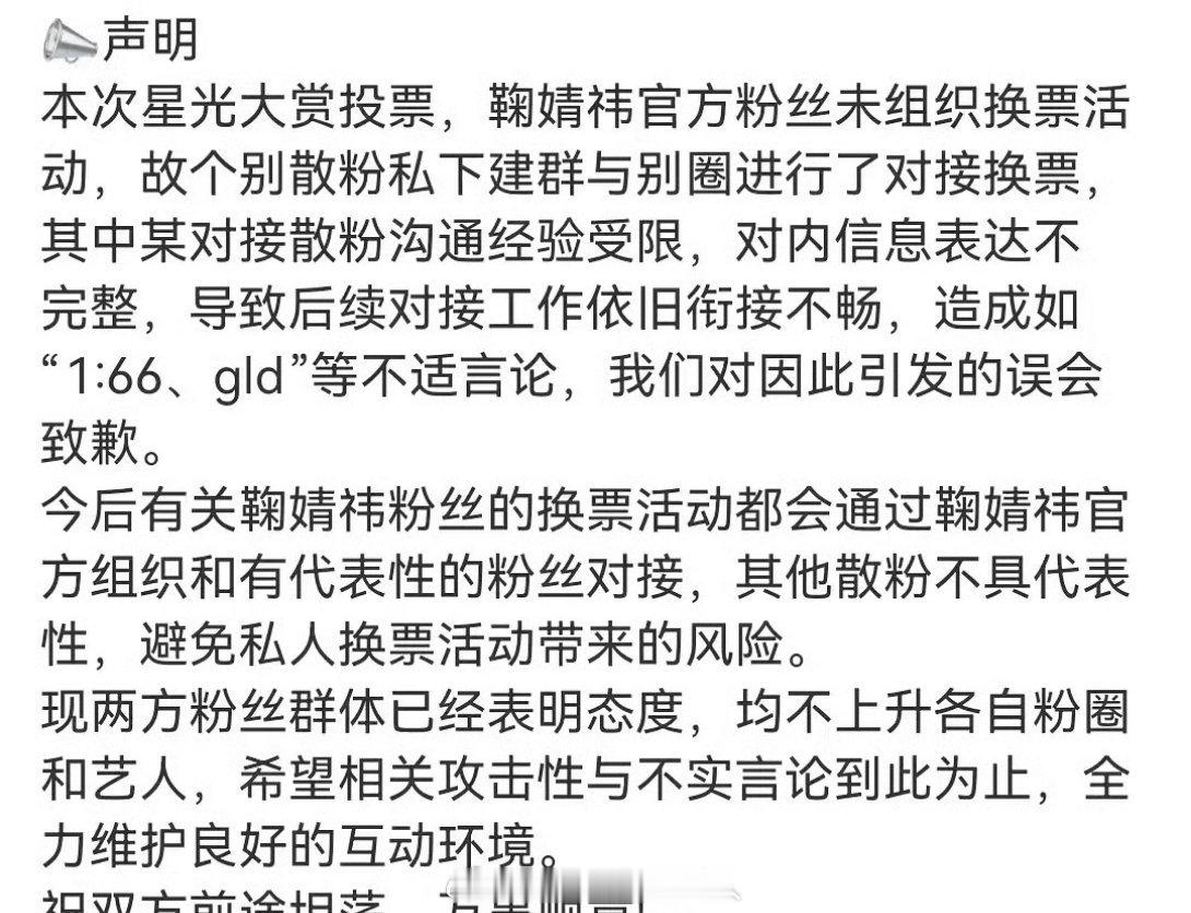 鞠婧祎粉丝和魔道祖师粉丝和解了,彼此发了个声明,这解决问题的速度比内娱很多工作室都快