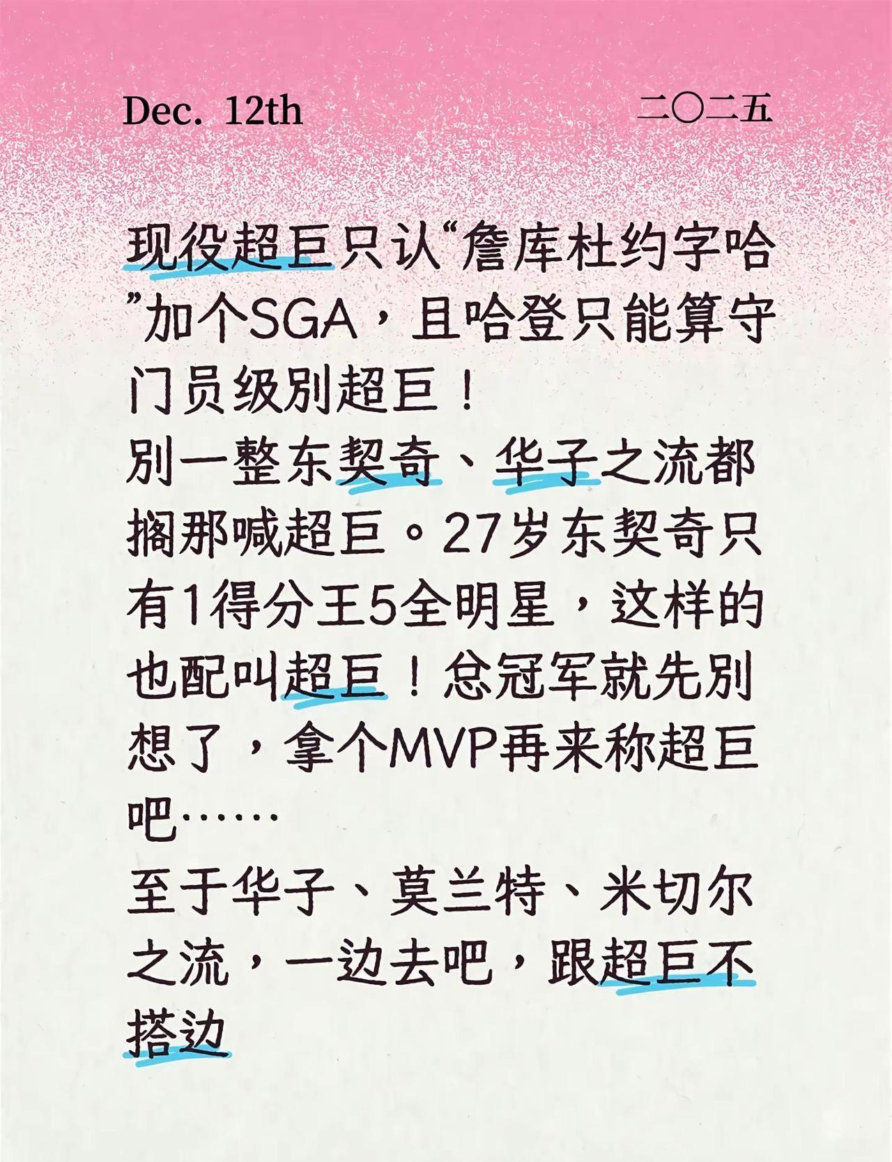 当数据表格像超巨,荣誉墙却像全明星时,你该怎么定义他? 东契奇正卡在这个缝隙里。27岁,他场均轰下33.9分,用后撤步和鬼魅传球写满高光集锦。 五次全明星首发,一次得分王,舆论已将他捧入神殿。 但翻看履历,MVP榜前三未进,分区决赛地板只摸到一次。 支持者说,看比赛影响力! 反对者冷笑:季后赛赢家才配谈超巨。 超巨的门槛从未改变:在最高舞台,用胜利定义时代。 库里用三分球重写了篮球法则,约基奇用中锋策应拿了冠军+FMVP。 字母哥从希腊街头冲到密尔沃基之巅。 他们不是在积累数据,是在雕刻历史。 年轻一代如爱德华兹,还在证明自己能稳定赢下系列赛。 莫兰特需要把飞天遁地转化为六月捧杯。 所谓“超巨守门员”哈登,恰恰是那道分水岭——你有无解杀招,但你能不能用它走到最后? 科比说过,总冠军戒指会开口说话。 真正的超巨,不是数据堆出的幻影,而是逆境铸就的丰碑。