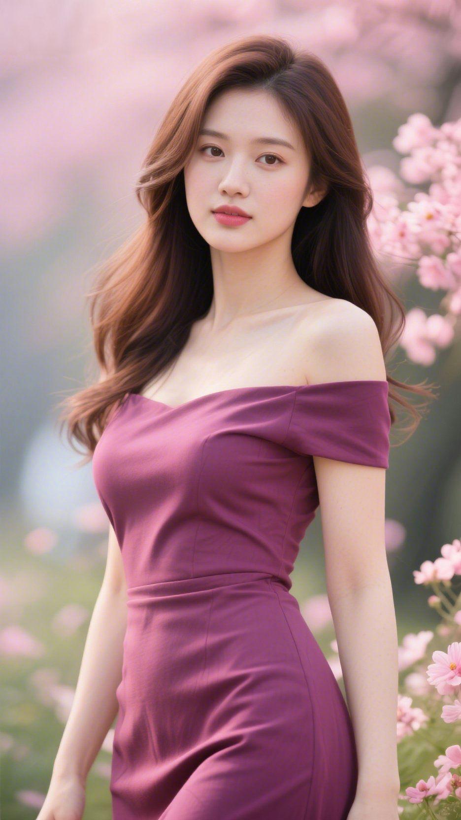 《春樱畔的紫衣轻扬》 风裹着樱花的淡香漫过肩头时,她正立在花影深处。藕紫色裙装舒展如雾,恰好裹住春日的软意,露肩的轮廓轻承着细碎光斑。 发梢沾了瓣粉樱,抬眼时,眼底漾着比花更柔的暖意——不必言语,周遭的节奏便跟着慢了下来。风过处,裙角轻晃,连空气里的香都浸了几分舒展。 春天从不是某朵花的独舞,是有人立在花海里,把季节晕成了一首轻缓的诗。她未展颜,可樱瓣落向肩头的刹那,风都似轻停了片刻:原来温柔本就是自带温度的模样。 春樱治愈系 春日穿搭感
