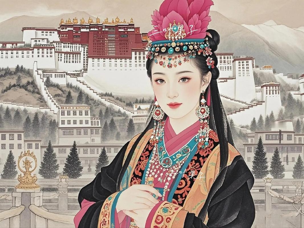 文成公主入藏:一段跨越千年的和亲传奇 在唐朝贞观年间,盛世繁荣的长安城中,传来了一则令人振奋的消息:唐太宗为了巩固边疆、促进民族融合,决定派遣一位公主前往西藏,与吐蕃赞普松赞干布结为姻亲。这不仅是一场普通的婚姻,更是一场跨越高原、连接东西的历史大事。唐朝选中的正是美丽聪慧、德行端庄的公主,她就是后来被尊为“文成公主”的女子。为了这场跨越千里的婚礼,唐朝朝廷精心筹划,礼部尚书江夏王、李道宗被任命为主婚使,携带着盛大的礼物和深厚的祝福,踏上了护送公主入藏的艰难旅程。 出发的那天,长安城的街道上热闹非凡,百姓们纷纷送行,祝愿公主一路平安顺利。公主身穿华丽的锦缎衣裳,脸上带着既庄重又期待的神色。她的心中既有对未知远方的好奇,也有对家乡的眷恋。伴随着鼓乐声和欢呼声,公主登上了装饰华美的马车,开始了漫长的西行之旅。沿途经过山川河流、平原丘陵,边疆的士兵和民众都以最热烈的欢迎迎接这位远嫁的公主。 一路上,公主展现出非凡的智慧和善良,她与士兵、牧民们亲切交谈,了解边疆的风土人情,也用自己的礼仪和善意赢得了大家的喜爱。经过千辛万苦,终于在河源附近的柏海迎接了松赞干布率领的群臣。那一刻,天高云淡,草原广袤,双方的目光交汇,仿佛天地都为这场盛大的和亲仪式而祝福。松赞干布身穿华丽的藏袍,笑容满面,迎接这位来自大唐的公主。双方的官员交换礼物,表达了对未来友谊与合作的美好祝愿。 随后,公主随着松赞干布一同返回拉萨。在那座雄伟的古城中,公主被迎入宫殿,亲眼目睹了藏族人民的淳朴与热情。为了表达对公主的尊重与欢迎,吐蕃王室为她修建了宏伟的宫室,宫殿中雕梁画栋,金碧辉煌,展现出藏族建筑艺术的独特魅力。公主在宫中不仅享受到了尊贵的待遇,还积极参与到宫廷的文化交流中,她学习藏族的语言、音乐、舞蹈,与当地的贵族和民众建立了深厚的感情。她用自己的善良与智慧,成为了中藏友谊的象征,也让两族的关系日益紧密。 文成公主的入藏,不仅仅是一场政治联姻,更是一段文化融合的佳话。她带去了唐朝的丝绸、瓷器、书籍,也带来了藏族的佛教、音乐和手工艺品。她的到来,成为了中藏交流的桥梁,促进了佛教在藏传地区的传播与繁荣,也推动了两地的经济和文化发展。在拉萨的宫殿里,她主持修建佛寺,弘扬佛法,成为藏族人民心中敬仰的“文成皇后”。她的善行和智慧,赢得了吐蕃人民的爱戴,也让中原文化在高原上生根发芽。 岁月流转,公主在藏地度过了数十载光阴,她不仅是吐蕃的王妃,更是中藏友谊的象征。她用自己的行动证明了文化交流的力量,也彰显了和平与合作的价值。她的故事在后世传颂,成为中华民族与藏族人民共同的宝贵财富。文成公主入藏的历史,不仅是一段跨越千里的姻缘,更是一段跨越民族、跨越文化的伟大篇章。在那遥远的古代,她用爱与智慧架起了一座连接东西方的桥梁,留下了永恒的传奇。文成公主传 藏语文成公主