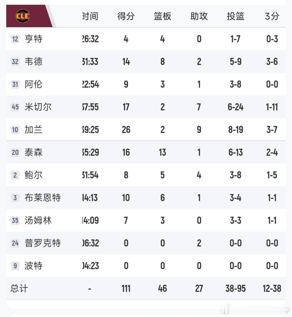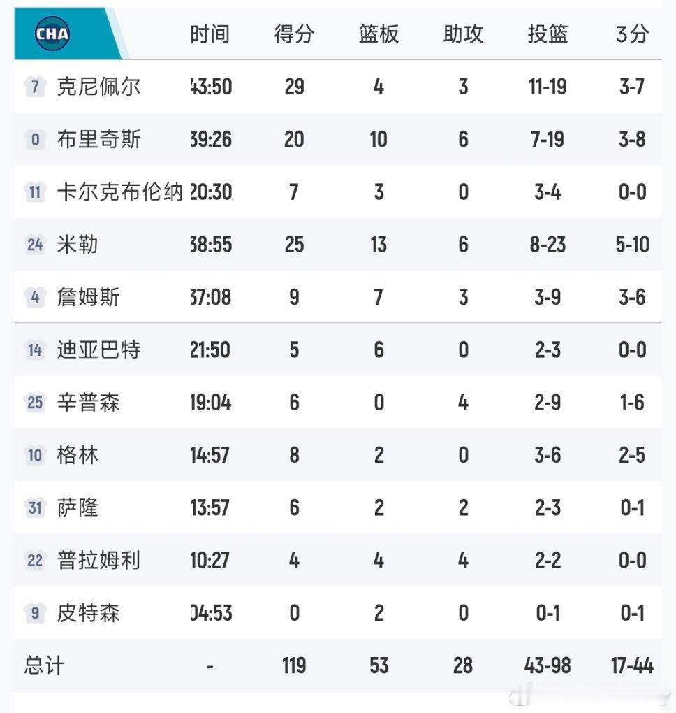 加时赛10投0中,0分!骑士加时111-119不敌黄蜂。克尼佩尔29分,米勒25分13篮板,布里奇斯20分10篮板。加兰26分,米切尔17分。