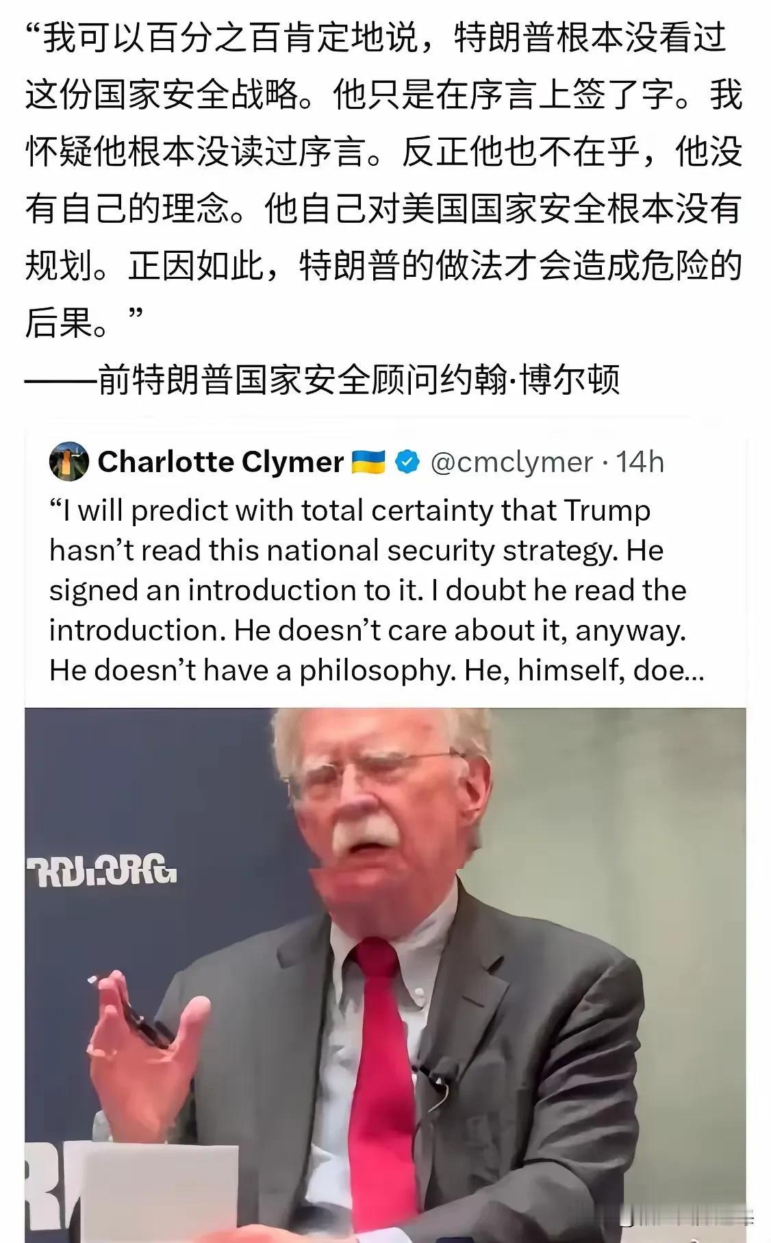 特朗普又搞事情了! 12月14日,前安全顾问博尔顿一句话炸锅:特朗普根本没看过国家安全战略,只在序言上签了个字。这话可不是随口说的,出自一个在白宫核心圈待过的人,分量太重。 这份战略文件,本该是美国全球布局的“总图纸”。结果呢?被当成形式主义的签字簿。博尔顿说他不在乎,没理念、没规划,全靠感觉拍板。这不是危言耸听,而是实打实的制度性风险。 想想这几年,退群毁约、盟友翻脸、外交反复。今天要和这个谈,明天又骂那个,政策像天气一样变来变去。这不是灵活,是缺乏战略定力的表现。 有人说是私人恩怨,但问题不在人,在机制。一个国家的顶层设计,怎能依赖领导人个人兴趣?真正的强国,靠的是制度、专业和连续性。 这事也给全世界提了个醒:大国博弈时代,稳定和信誉才是真正的软实力。靠噱头和情绪治国,终究走不远。
