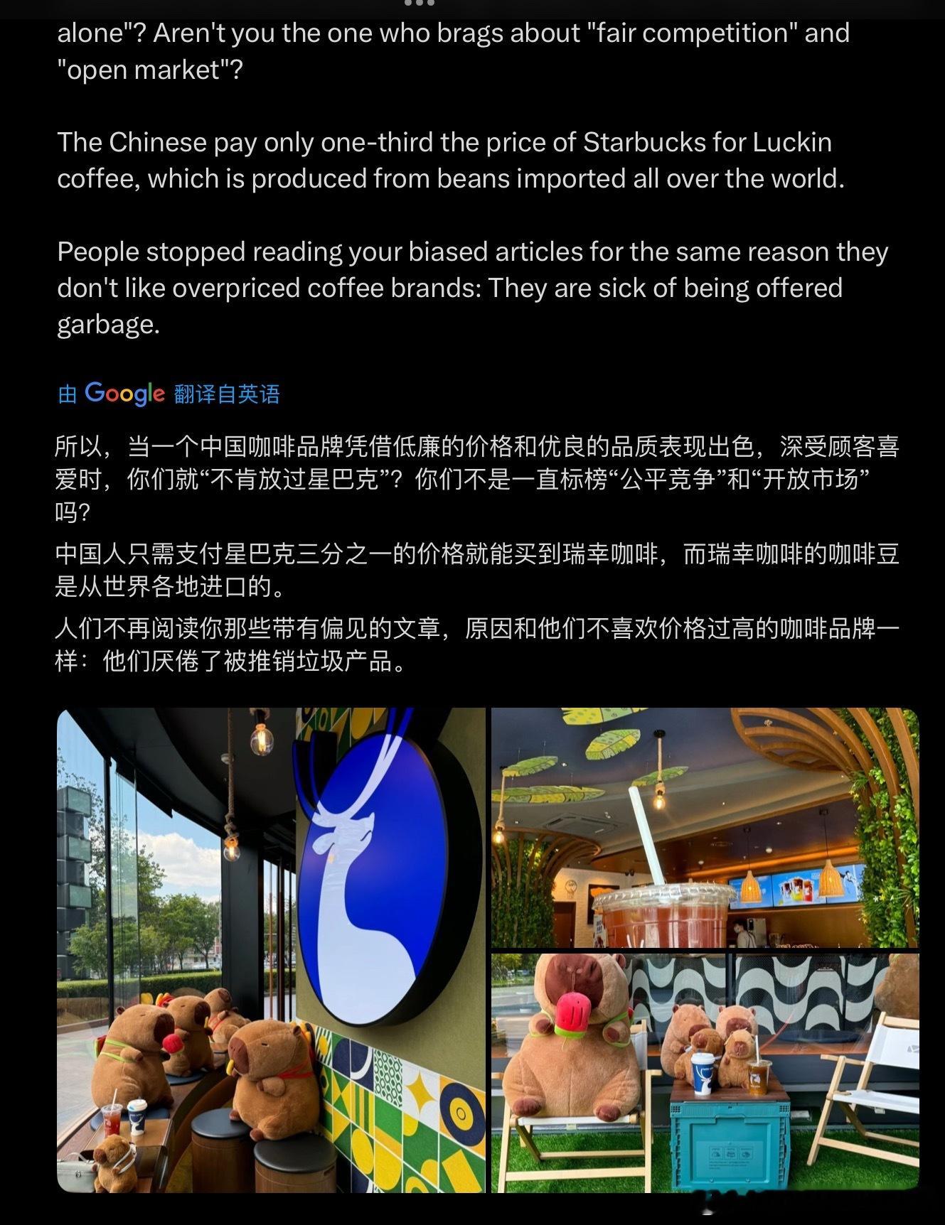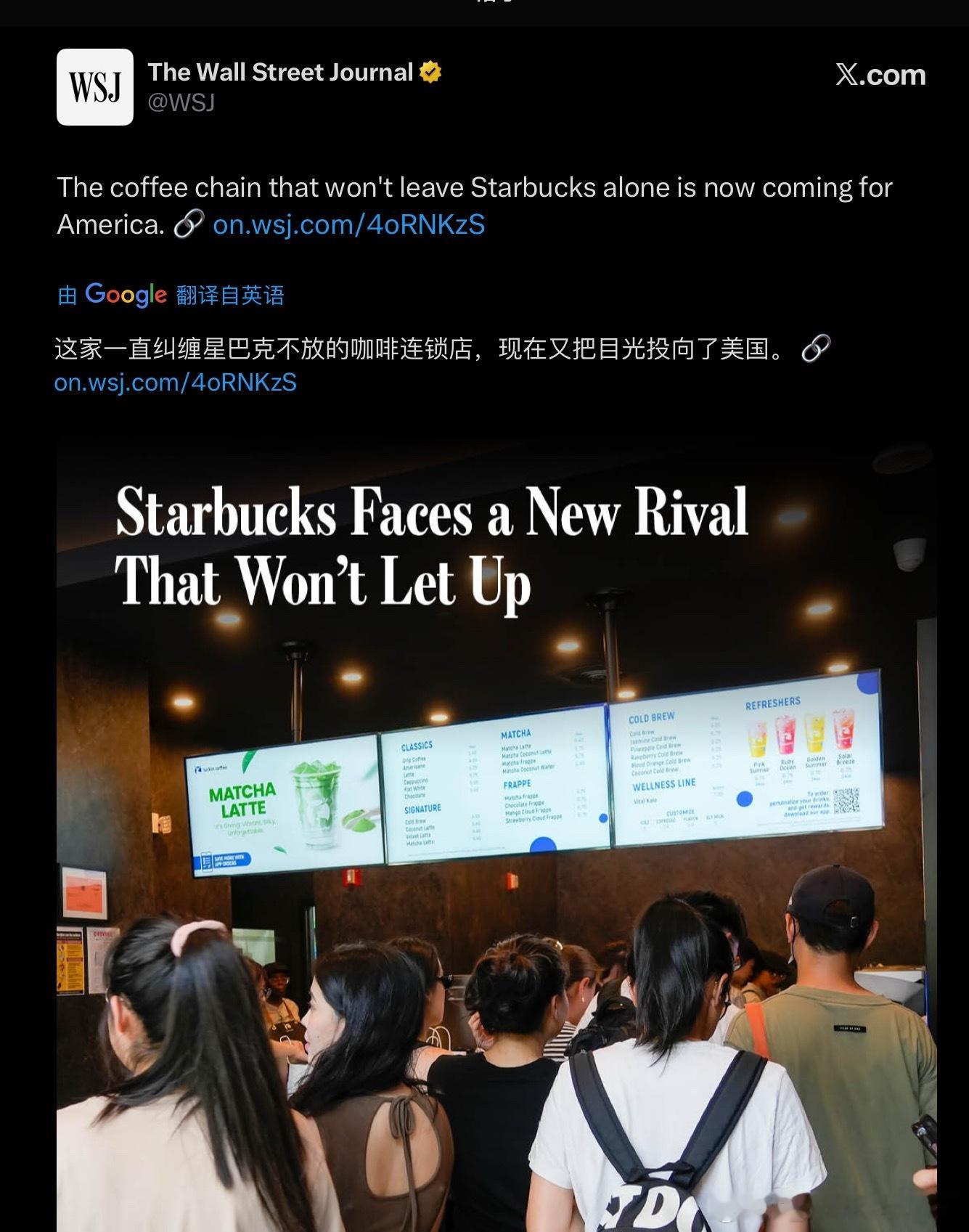 WSJ报道中国咖啡品牌:“对星巴克死缠烂打的中国咖啡又将目光投向了美国市场”啊不是,为什么某些欧美人总有种全世界都围着他们转都在关注他们的错觉。人家瑞幸咖啡做得好跟你星巴克有什么关系?有人关心星巴克怎么样嘛?西方不是天天嚷着“开放市场”和“公平竞争”吗?怎么,中国的咖啡品牌做强做大了,你们就不舒服了?几十年前或许星巴克在中国还被当作什么高级洋品牌看,如今这么看的中国人只会被嘲笑土。一杯咖啡而已,还喝出优越感了