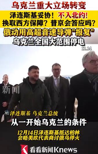 打了四年,泽连斯基终于愿意妥协! 当地时间12月14日,泽连斯基在德国柏林和平谈判前夕宣布,乌克兰愿意放弃北约成员资格,以换取美国、欧洲、日本和加拿大等国家和地区的法律约束性安全保证。 这句话一出来,外界第一反应不是“和平要来了”,而是嗅到了压力的味道,因为这个转向出现得太精确,正卡在关键会谈之前,也卡在他准备与美方特使威特科夫、库什纳接触之前。 表面是为停火开路,实际上更像是在给特朗普团队递一张“我愿意谈”的名片,特朗普多次公开不满基辅不愿意停火,也对迟迟不选举颇有意见。眼下美国政局即将换挡,泽连斯基不可能装作没看见。 西方媒体的解读更直接。《金融时报》等认为,这不是突然想通了,而是看清了盟友的耐心正在见底,乌克兰的腐败争议反复冒头,战线又持续吃紧,援助在国会和欧洲议会里被拉扯得越来越难看。 对一些支持者来说,继续投入的政治回报在缩水,风险却在上升。基辅此时提出“退一步换安全保证”,就是想把局面从失血状态拉回到可控范围,至少先把俄军按在现有阵地,别再扩大损失。 但俄乌打到第四年,乌克兰最怕的不是条件不好听,而是越拖条件越差,继续消耗下去,前线可能失去的不只是几处阵地,还可能把谈判筹码一起输掉。 更现实的问题是政治生存。战事久拖不决,国内压力会累积,外部援助一旦明显降温,泽连斯基在特朗普的强硬催促下被迫让位,并非完全没有可能。对他而言,尽早把战争按下暂停键,也许反而是能保住局面的一条路。 不过,乌克兰现在抛出的“放弃加入北约”,在俄罗斯眼里最多算入门条件,莫斯科过去的立场已经摆过多次:不进北约只是最低门槛,后面还有领土和安全安排等更硬的议题。 更关键的是,俄罗斯目前握着战场主动权,当然会把优势拿来谈价。换句话说,泽连斯基的这一步,未必能换来他想要的“法律保障”,更可能只是把谈判拉回轨道,让各方开始算账。 特朗普目前还没有给出明确回应,但这场博弈的走向大致清晰:美国新政府更在意“尽快收尾”的政治收益,欧洲既想停战又怕承担后果,日本和加拿大的承诺再写得漂亮,也离不开美欧的实际执行。 乌克兰若指望一纸约束就能替代现实力量,风险很大,柏林谈判前夜的这一转身,说明基辅已经意识到,外部支持不是无限的,时间也不是站在自己这边的。 接下来真正难的,是把和平协议变成结果。停火、边界、争议地区的安排、后续安全框架,任何一项都足以让谈判反复拉扯,俄乌谈判现在还只是开始。