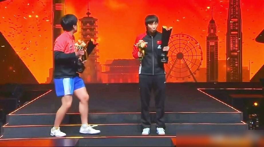 我去!好好一个冠军合影,被张本智和搞得偷感十足! 事情是这样的:总决赛拿了金牌要合影,张本智和第一次参加这种冠军合影,现场流程对他来说有点陌生。 一开始他把花先放一边,看到旁边的鳗鱼手里拿着花,又犹豫着把花拿回来,那一下真的很手足无措。 后面礼花一放,他明显被吓到,整个人下意识回头看,动作太真实了,完全是没预判到流程的那种。 说实话,我倒不觉得是“没礼貌”,更像是新人第一次站在这种场合的紧张,全写在肢体语言里了。 反过来看,鳗鱼是真的稳,花在手、镜头在前、礼花在响,人一点不乱,大赛经验这块一眼就能看出来。 也挺有意思的,一个是初来乍到的冠军,一个是见惯大场面的老将,同框的时候差别特别直观。 所以这画面好笑归好笑,我更觉得是名场面级别的反差:一个在适应身份,一个早就和冠军合影融为一体了。