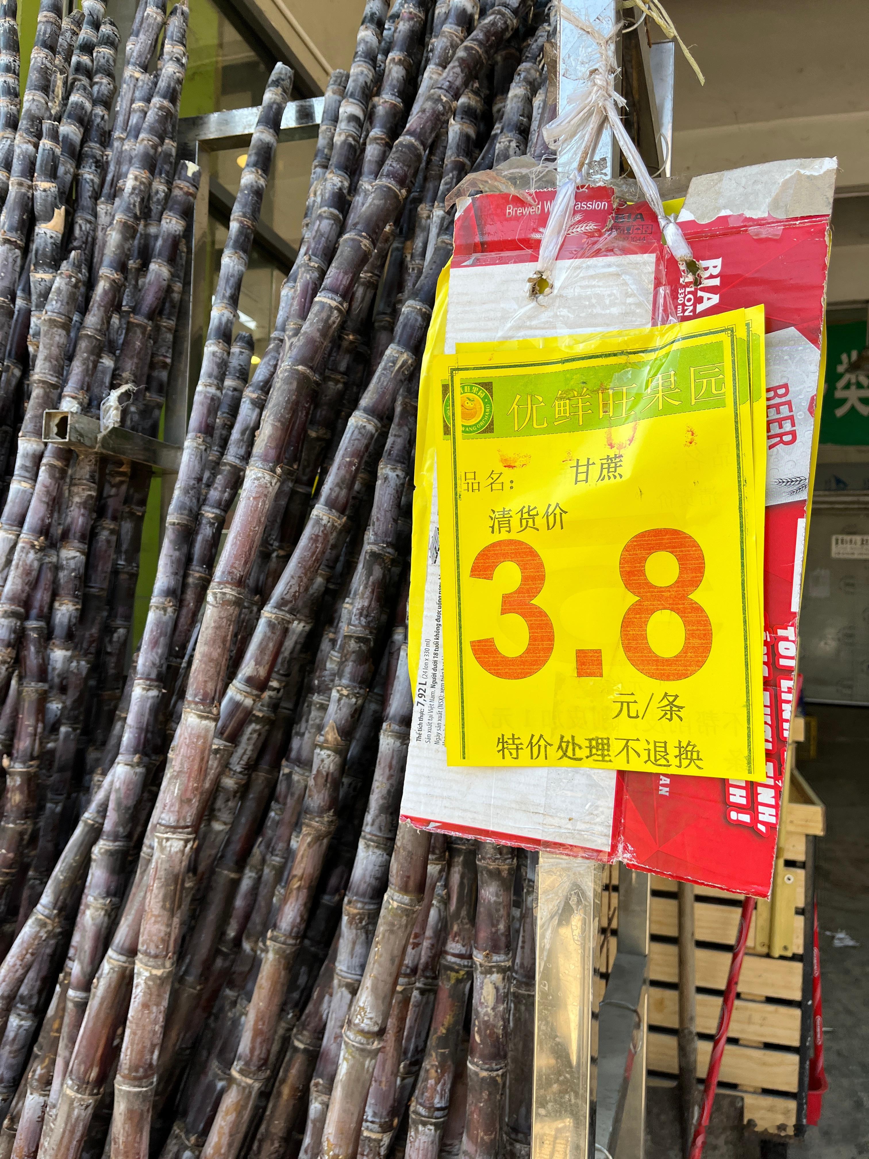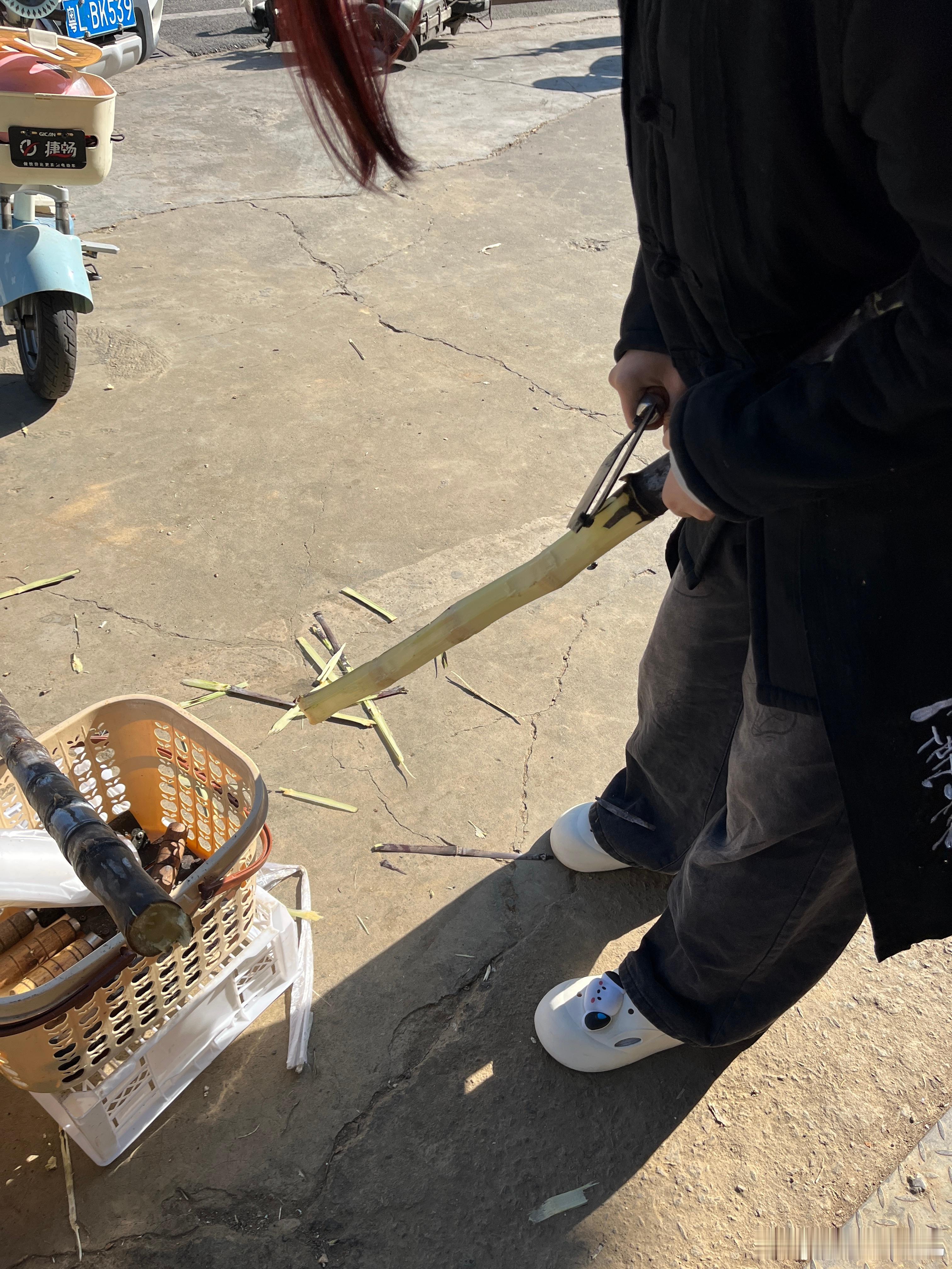 公园回来看到卖甘蔗的,好久没吃了,来买一根,你们那边是多少钱一根,这里10.8,但是不帮忙削皮,削皮要加一块钱。我削了一下,不行,后面叫人家帮我削的,这个妹妹也不太会,说好难削皮,因为要用力,削到后面一截,说我来试一下,结果我又可以了,前面我没用到力,所以削不到。冬天必须要吃甘蔗,不然不完美了。小的才3.8块,应该是放很久了,处理的。
