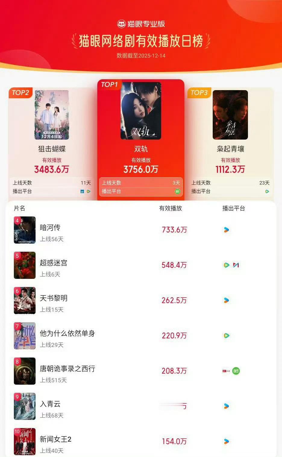 虞书欣主演双轨猫眼热度日榜和猫眼播放日榜均登顶第一☝️