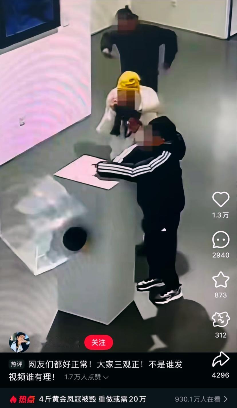 天价凤冠“陨落”!是熊孩子太皮,还是保护措施太“脆”? 这事发生在上个月底,在北京一家叫X的美术馆里,网红张凯毅发视频说,她老公亲手做的四斤重黄金凤冠,在展览时被一个小男孩碰了一下展柜,罩子晃动后凤冠掉在地上摔坏了,监控拍得很清楚,那小孩对着玻璃哈气擦玻璃,手一带罩子,结构不稳东西就掉下来,张凯毅后来在视频里提到不索赔,因为买了保险,只想问问怎么定损,发完视频她把私信关了,再没回应。 这个展览是由她丈夫发起的,与美术馆合作举办,主题定为“爱”,从十月初开始,一直持续到明年一月,展出的作品有一百多件,作者共八十七位,那顶凤冠是私人定制的艺术品,不是博物馆收藏的古董,它很值钱,也很特别,属于普通人平时见不到、但一看就觉得贵重的东西,问题是它被放在公共美术馆里,没有特别的保护措施。 美术馆后来回应说,那个罩子本来就没固定死,是设计上的问题,有做黄金加工的人看了视频后表示,这个凤冠工艺太复杂,修起来比重新做一个还难,工费最少要二十万,按照品牌标准来算,能达到四十万,这说明这件东西不是普通展品,它一旦损坏,几乎没法按原样修复,但展览方好像没意识到这点,也没给它配上防震或防碰的装置。 律师分析了责任问题,分成了三个部分,一是展柜设计方没有考虑到展品价值,结构做得太松散,二是美术馆作为场地管理方,没有贴出“请勿触摸”的牌子,也没有确保罩子能够承受意外碰撞,三是孩子父母的责任,因为孩子年龄小,责任归监护人,但如果当时家长在拍照没管孩子,那责任就会更大,法律上这些说得清楚,但实际操作中谁该赔多少还得看现场的具体细节。 这件事其实暴露了一个大问题,私人高价值艺术品进美术馆,没人管安全标准,故宫和国博这种地方,展品有红外感应、防震台、报警系统,层层防护,普通美术馆平时展出画或雕塑,不会想到要防小孩哈气导致坠落这种事,制度上没规定,大家就默认按常规走,结果出了事才想起来补漏洞。 张凯毅没有提出赔偿要求,而是让大家不要网暴孩子,这个做法显得很明智,她没有把问题指向孩子或家长,而是借这个机会提醒大家关注展品保护的问题,她关闭评论和私信,可能是因为担心舆论失控,也可能觉得事情已经从个人纠纷变成了公众讨论的话题,毕竟现在很多人去美术馆不是为了欣赏艺术,只是为了拍照打卡,安保措施跟不上这种情况,出事是早晚的事情。 2025年发生好几起展览损坏事件,情况都很接近,网红展览突然火了,观众数量增加,安保措施却没有及时跟上,展品价值越来越高,展示方式却还是老一套,大家只顾着拍照发到朋友圈,没有人认真考虑这些艺术品放在那里是否安全,这次凤冠摔坏只是一个开始,以后可能会有更贵重的物品出事,责任问题现在还没有明确说法。