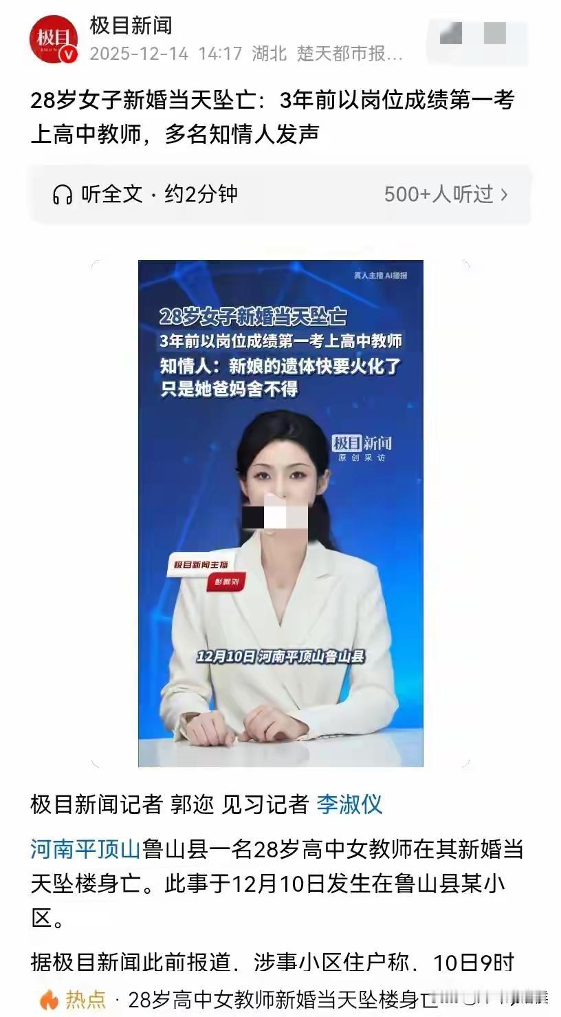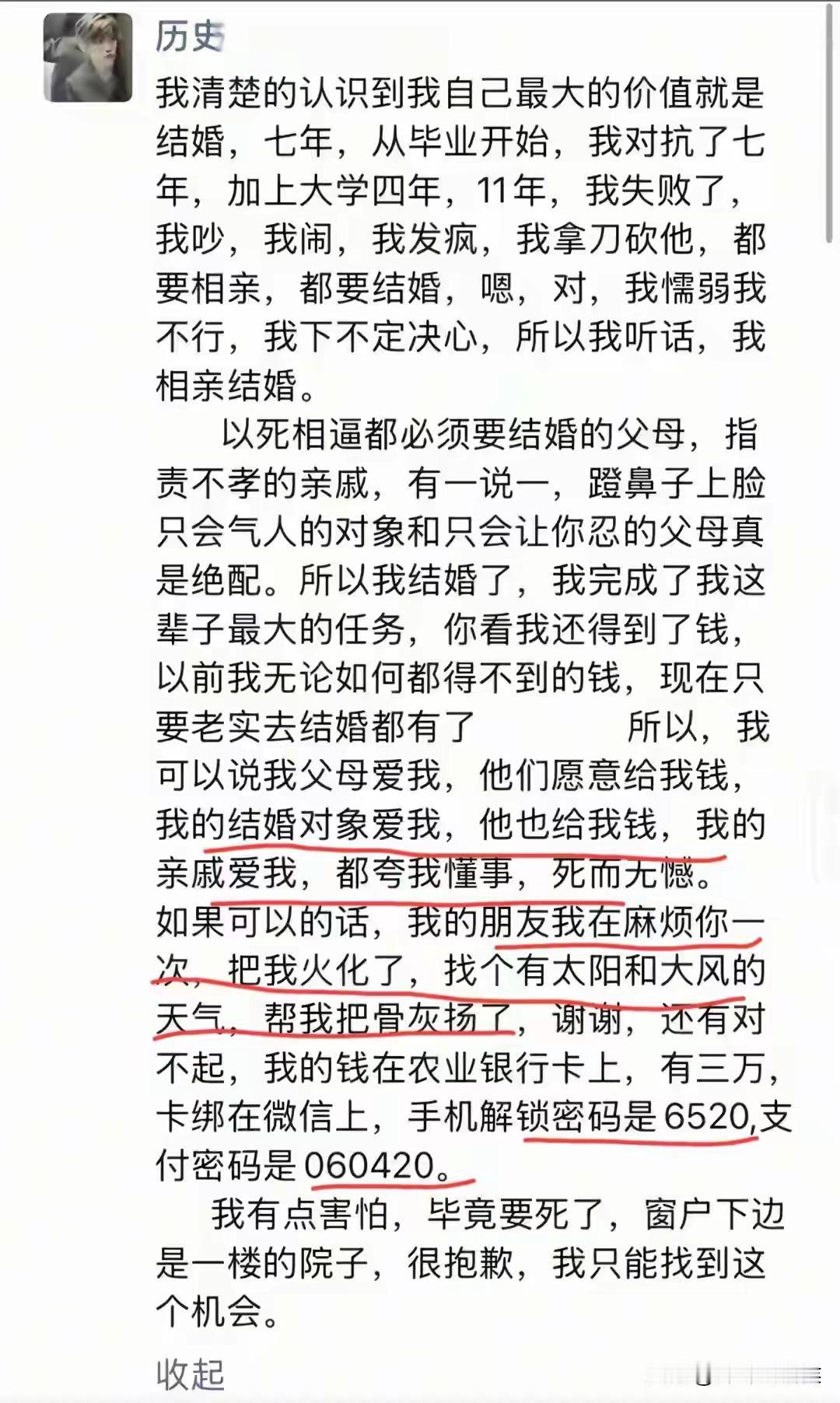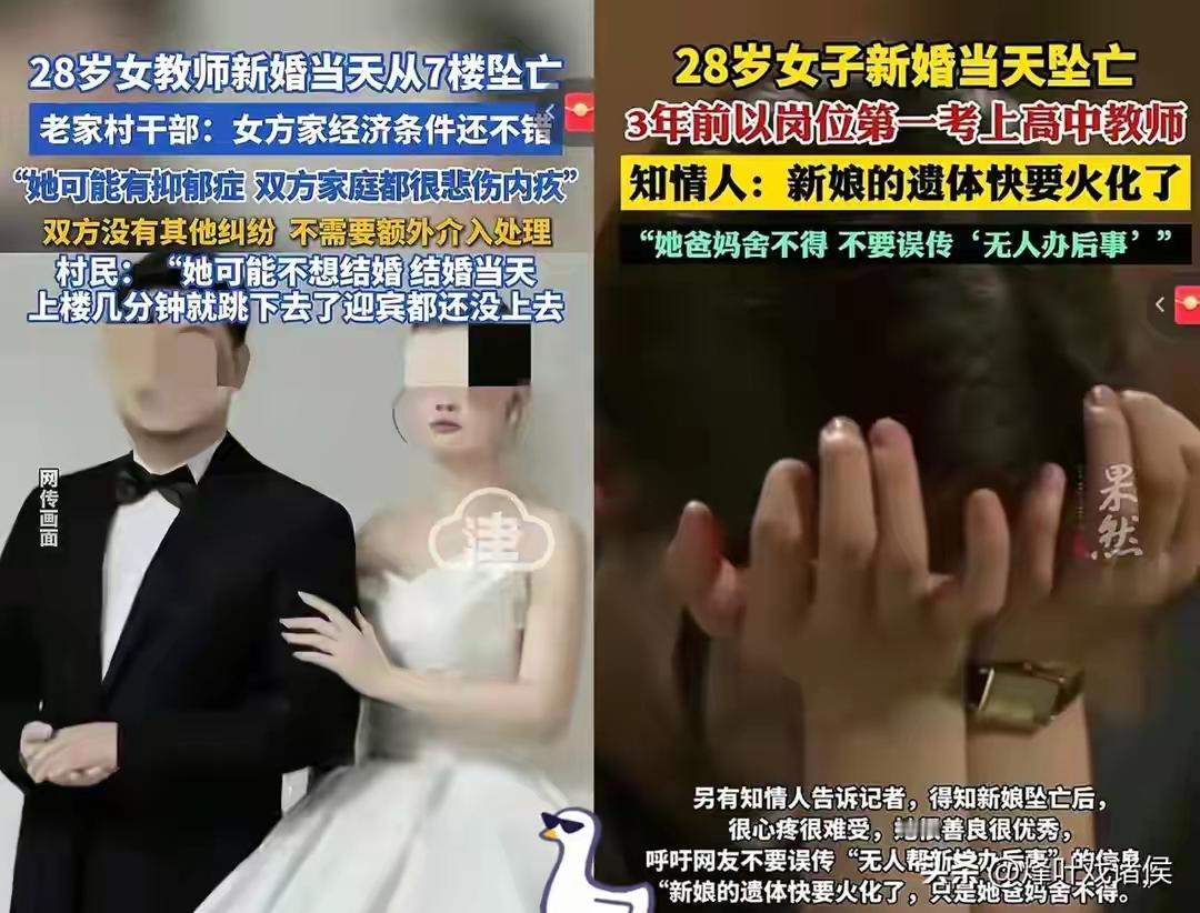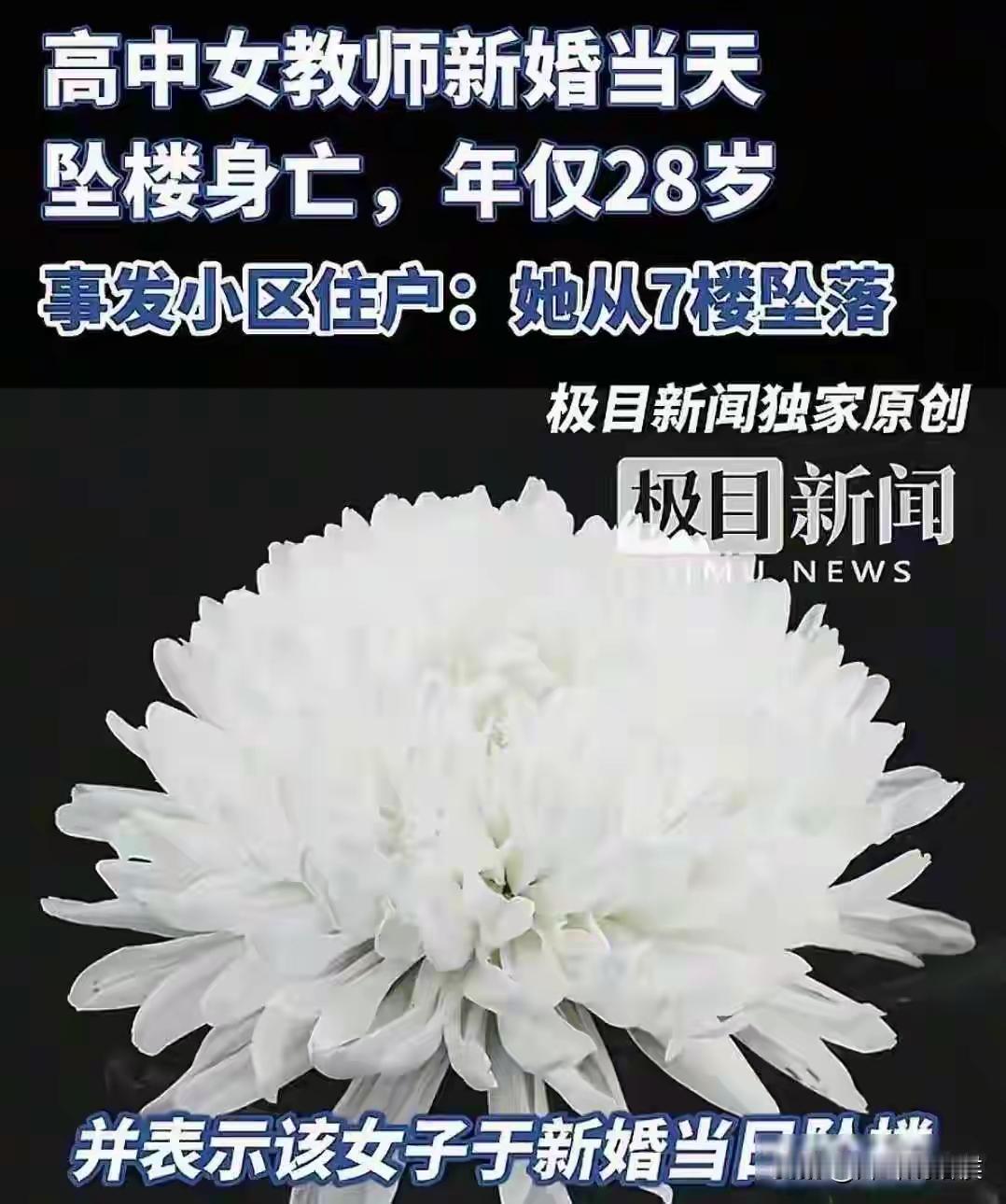 作为一名高中历史老师,书是白读了。婚姻不顺,可以自己做主分手。父母再强势,男朋友再强势,不可能以死相逼。选择死亡,只能说明自己的无能与无情无义。自己可以一了百了,自己的父母和男友,则是一辈子的心理阴影。 婚姻的本质是为了过上幸福的生活,否则千万不要步入婚姻。婚后一地鸡毛,要婚姻干什么。希望这次的婚姻悲剧为今后的人敲响警钟,千万不要步其后尘!