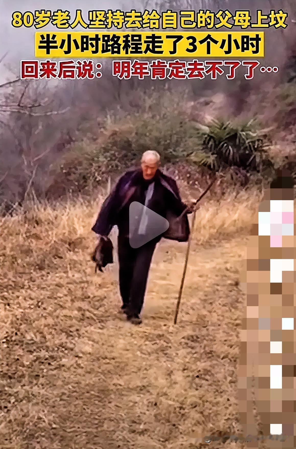 80多岁的老人感觉自己活不长了,弥留之际,他想去给父母上最后一次坟。本来半个小时的山路,他却蹒跚的走了三个多小时。 80岁老人蹒跚三小时爬山路,只为给父母上最后一次坟,那句“爹、娘,我来赴约了”,戳中了多少人的心窝。 谁能想象,八十多岁的身躯早已被岁月压弯,腰杆挺不直,背驼得快贴到地面,手里攥着根磨得发亮的老拐杖,每走一步都要先把拐杖扎稳,再慢慢挪动双腿,腿肚子抖得像筛糠,却半点不敢松懈。 山路还是当年的山路,只是比以前更陡更滑,路边的荆棘疯长,刮得他破旧的裤腿丝丝缕缕,小腿上渗出血珠也浑然不觉,眼里就盯着山顶那片藏着爹娘坟茔的树丛,那是他这辈子最牵挂的归宿。 年轻时他走这条路,二十分钟就能跑个来回,爹娘总在山顶等他,手里揣着热乎的红薯或野枣,笑着喊他慢点跑。如今红薯的甜味还在记忆里,爹娘的声音却早已消散在风里,只剩他一个人,在这条路上挪得无比艰难。 走几步就喘得厉害,胸口闷得像堵了块石头,冷汗顺着满脸皱纹往下淌,浸湿了单薄的里衣,他就扶着树干歇半分钟,咳嗽几声又接着走。旁人劝他别折腾,雇人帮忙打理就行,他却摇着头说:“不行,得我自己去,爹娘在等我,我得去赴约。” 出发前,他特意从柜子最深处翻出个油纸包,里面是他攒了几天的桃酥,那是爹娘生前最爱吃的点心,他小心翼翼揣在怀里,时不时摸一摸,生怕颠碎了,更怕凉了爹娘不爱吃。 三个多小时的煎熬,终于爬到坟前,老人再也撑不住,双腿一软跪在地上,膝盖磕在石头上发出沉闷的声响,他却顾不上疼,先伸手拂去坟头的落叶和杂草,指尖划过冰冷的坟土,像是在触碰爹娘温热的手掌。 他慢慢把桃酥摆到坟前,声音沙哑得几乎听不清,却一字一句咬得格外用力:“爹、娘,我来赴约了……这辈子我没辜负你们,现在我要来找你们了,以后再也不分开了。” 这话一出口,老人浑浊的眼睛里滚出泪珠,砸在坟头的青草上,瞬间洇湿一小片。八十岁的人了,在爹娘面前依旧是那个盼着回家的孩子,哪怕爹娘早已化作一抔黄土,这份牵挂也刻进了骨血里,直到生命最后一刻都没放下。 总有人说忙工作、忙生活,陪父母的时间以后有的是,可岁月从来不会手下留情,等你想好好尽孝的时候,可能连见父母一面的机会都没了。这位老人用最笨拙、最艰难的方式,告诉我们什么叫“百善孝为先”,也戳醒了多少忽略父母的人。 我们总以为人生很长,来日方长,却忘了父母在一天天变老,能陪伴的时光越来越少。老人最后的奔赴,不是一场简单的扫墓,而是对父母最深沉的告别,更是对儿女本分最真挚的坚守,这份纯粹的孝心,比任何华丽的辞藻都更打动人。 父母在,人生尚有来处;父母去,人生只剩归途。这句话听了无数次,可真正读懂其中滋味的,往往是失去之后。老人用三个小时的蹒跚步履,把“牵挂”二字写得淋漓尽致,也让我们明白,孝心从来经不起等待,珍惜当下陪伴父母的时光,才不会留下终身遗憾。 各位读者你们怎么看?欢迎在评论区讨论。