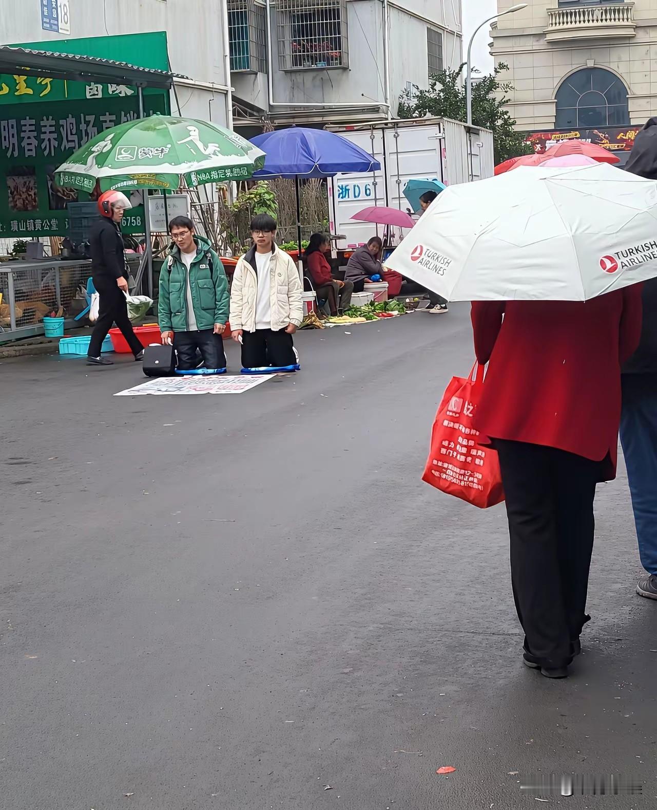 这对比简直太讽刺了! 市场的这一边是80多岁的老人,他们佝偻着身体、花白的头发、沧桑的容颜,但仍在卖菜维持生计; 而市场的另一边是二三十岁的年轻人,他们却跪的笔直,在乞讨。 多么鲜明的对比,太讽刺了!年轻人身体强壮,精力旺盛,然而他们却不愿意出力挣钱,而是践踏自己的尊严,靠乞讨维持生活。 现在有些年轻人,靠啃老过着优渥的生活,而父母却省吃俭用养着儿子孙子。; 还有些年轻人拈轻怕重,游手好闲,而父母却六七十岁了还在打工。 前者用皱纹里的倔强撑起尊严,后者拿青春当筹码乞讨苟活。 岁月从不是衰老的标尺,不肯站着谋生的灵魂,才先一步佝偻了腰。