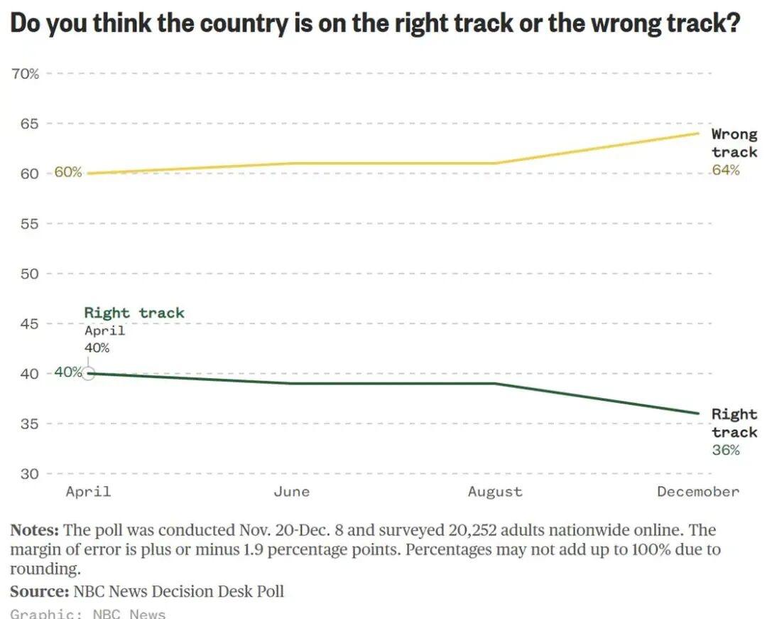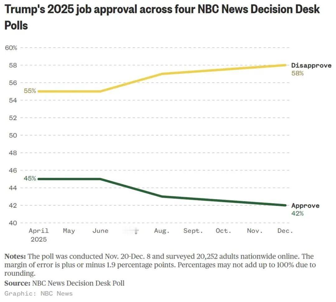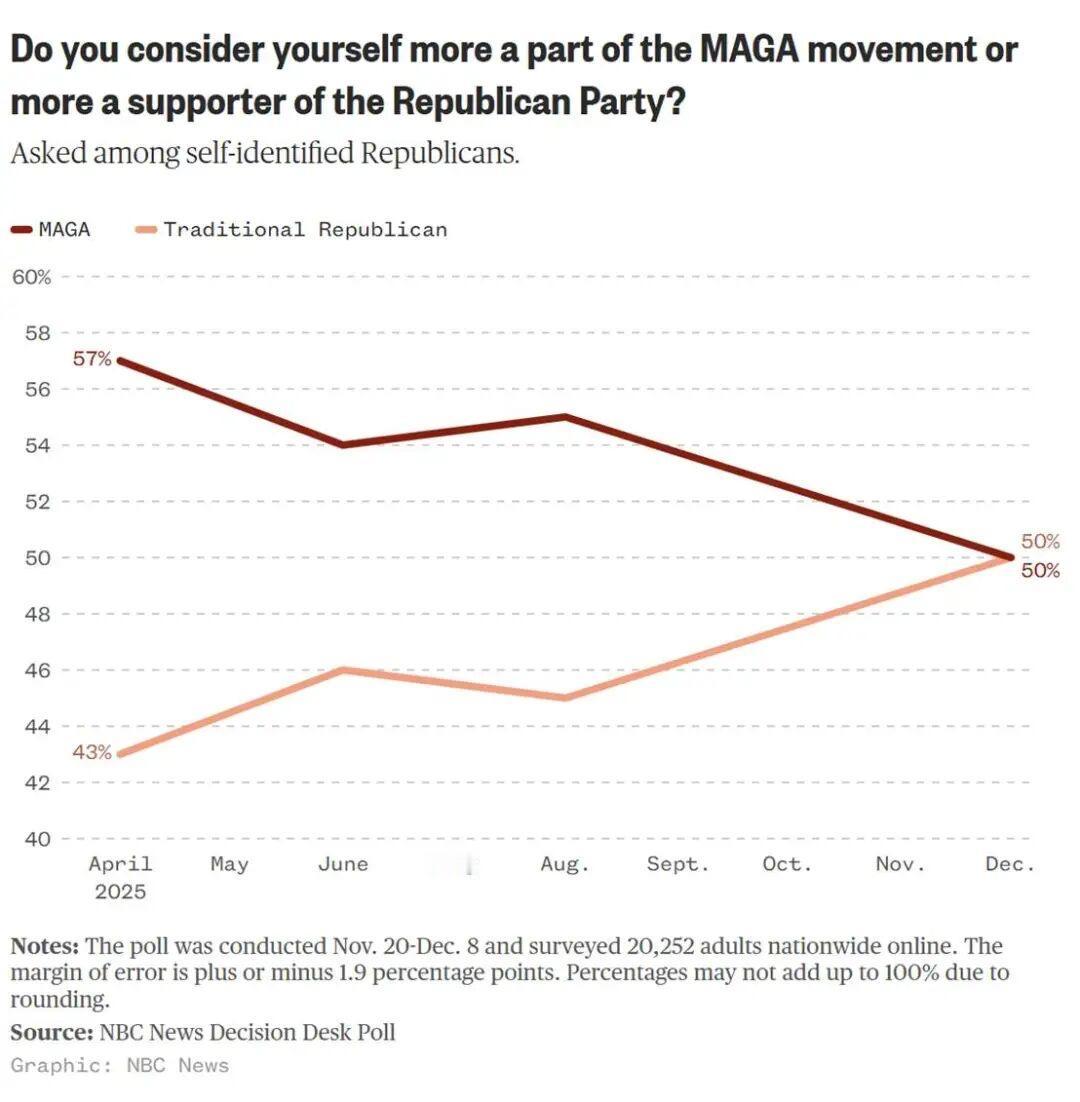 据美国全国广播公司和SurveyMonkey联合进行的一项最新民调显示,在特朗普重返白宫近一年之际,他在成年美国人中的支持率仍持续低于反对率,而且在其MAGA基本盘中的支持也有所流失。今年以来,在民众担忧经济前景的背景下,特朗普的支持率有小幅下滑,其支持率从4月的45%降至当前的42%,不支持率从4月的55%升至58%。尽管特朗普在竞选期间承诺缓解通胀和生活成本问题,但美国人仍对物价和开支感到焦虑。民调显示,这种担忧体现在日常消费决策中,例如食品杂货购物、假日消费等方面。特朗普的其他一些高调决策也在民众中引发负面反应,包括他对“爱泼斯坦文件”争议的处理方式。特朗普最初反对国会推动强制公开这些文件,但在上个月承受来自两党的压力后最终让步。总体而言,这项民调凸显出特朗普赢得第二个总统任期所依赖的强烈支持正在减弱,而反对他的力量和强度则在上升。 对特朗普强烈支持降幅最大的两个群体是自我认同为共和党人者和自我认同特朗普“MAGA”运动的群体。在认为自己更倾向于支持共和党而非MAGA运动的共和党人中,对特朗普“强烈支持”的比例已从4月的38%降至目前的35%。而在自认为是MAGA共和党人的群体中,特朗普的“强烈支持”率也已从4月的78%降至70%。4月时,多数共和党人表示认同MAGA运动;而在本次调查中,有一半的共和党人更认同传统的共和党支持者身份,一半更认同MAGA运动成员的身份。 图片来源于网络