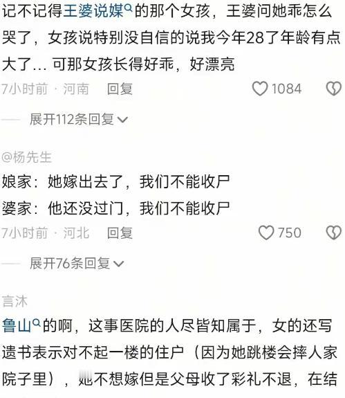 让婚礼变葬礼 这样的父母昏了头啊? 河南一位28岁的姑娘在婚礼当天从7楼纵身跃下,结束了自己新娘子的年轻生命。 到底发生了什么?这女孩是当地重点高中的历史教师。为了完成父母催婚的愿望,违心答应结婚。 12月10号早上,河南鲁山县尧山大道的小区里还飘着婚庆唢呐声,楼道墙上刚贴的红喜字还没干透,7楼突然传来一声闷响,28岁的新娘从楼上掉了下去。 一楼刚装修好的小院里,粉红色被子轻轻盖着她,警笛声很快划破了喜庆的空气。 这姑娘叫魏亚蕊,是当地高中的历史老师。 2022年考编时,她以历史岗位笔试、综合双第一的成绩考上,学生们总说她的课有意思,能把鲁山花瓷碎片带到课堂讲家乡历史,暴雨天还开车送没伞的学生回家。 同事记得她办公桌里总备着糖,学生考砸了就塞一颗,说日子会甜起来,可她自己的日子好像从没甜过。 了解她的人都知道,这个站在讲台上发光的姑娘,早就在催婚里熬了11年。 从17岁上大学开始,父母就天天念叨“女孩子读再多书不如嫁得好”,放假回家客厅总坐着陌生相亲对象。 工作后母亲干脆收走她的工资卡,每月只给500块饭钱,说要存着给弟弟娶媳妇。 她不是没反抗过,和父母吵到哭红眼睛,相亲后连夜逃回学校,可母亲追到学校哭着喊“你不结婚,全家在村里抬不起头”。 今年28岁,她终于“妥协”了,父母说男方有房有车,没问她喜不喜欢就定了婚。 拍婚纱照时她嘴角没笑意,手悄悄攥着片花瓷碎片,那是她给学生讲“自由”的教具。 婚礼前一天凌晨,她在朋友圈写“对抗11年,还是输了”,又很快删掉。 那天她还在学校上课,笑着跟同事说“先上完课,别耽误学生”,没人知道她早做好了决定。 10号早上穿好婚纱进了7楼婚房,几分钟后就发生了意外,连迎宾都没开始。 村干部说她“可能有抑郁症”,可学生翻出她没批改完的试卷,最后一页写着“你写的《自由》读后感最动人”。 这个教学生勇敢做自己的老师,没能给自己留条路,她最后拜托朋友,把骨灰撒在有风的地方,“别埋老家,怕下辈子还被催婚”。 楼道里的喜字被风吹卷了边,沾了泥,谁能想到这场婚礼成了终点,11年催婚,终究熬成了悲剧。 以上都是个人观点,对此您有什么不同的看法,可以在评论区留言讨论!!! 信息来源:2025-12-1419:55红星新闻