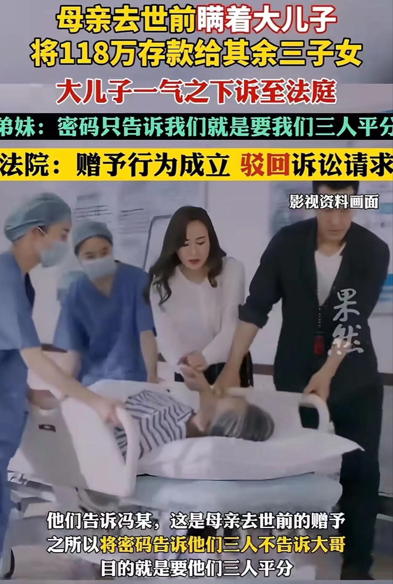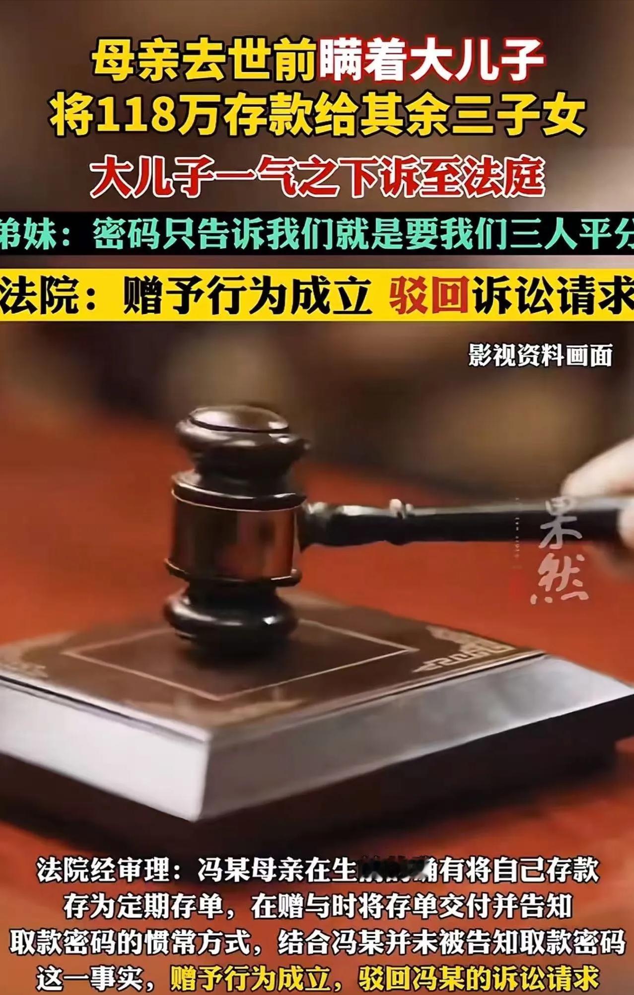 母亲刚下葬,存折里的118万就没了。青海西宁的冯大哥,强忍着悲痛收拾母亲的遗物。当他翻开那个熟悉的铁皮盒子,找到母亲珍藏的几张定期存单时,手突然抖了一下——存款余额:0。 他揉了揉眼睛,以为看错了。可白纸黑字,118万元,不翼而飞。 他发疯似的跑到银行。 工作人员查询后告诉他:钱是在近几个月,分多次被取走的。取款人,是他的亲弟弟和两个亲妹妹。 那一刻,冯大哥觉得天旋地转。母亲尸骨未寒,至亲的弟弟妹妹,竟然背着他,把母亲的养老钱偷偷分了,连声招呼都没打。 “我们是亲兄妹啊!这钱是遗产,该四个人平分!”他找到弟妹,压着怒火讨说法。 弟妹们的回答,却像一盆冰水,把他浇了个透心凉。 “大哥,这钱不是遗产。是妈生前特意给我们仨的。” “妈走之前,就把密码告诉我们了,单单没告诉你。意思还不够明白吗?这钱,就是我们三个平分。” 冯大哥彻底懵了。他从未听母亲提过只言片语。更让他无法接受的是:钱是在母亲去世后才取出来的,这怎么就不算遗产了? 一家人吵得不可开交,最后对簿公堂。 法庭上,双方撕破了脸。弟妹坚持是“母亲赠与”,大哥坚称是“遗产侵占”。 法院最终的判决,让冯大哥如遭雷击:驳回他的诉求,认定118万元属于母亲对弟妹三人的“生前赠与”。 为什么?法律上看,关键就一把“钥匙”——密码。 法院调查发现一个重要习惯:冯母过去赠与他人钱款时,都是把存单给对方,并告知密码。在这个案子里,母亲只把密码给了三个子女,唯独没给长子。这个行为,在法律上被视为她在生前就已经完成了“赠与”的意思表示。至于钱是生前取还是身后取,不影响赠与的性质。 也就是说,母亲用“不给密码”这个沉默的方式,已经做出了她的财产分配。法律尊重了她生前的这个决定。 一场官司打完,钱没了,亲情也碎了一地。 街坊邻里议论纷纷。有人说老人糊涂,埋下了家庭不和的种子;也有人猜测,是不是大哥哪里做得不好,伤了母亲的心?更有人感叹:早知如此,母亲若能留下一纸遗嘱,把话说开,或许就能避免这场至亲反目的悲剧。 清官难断家务事,但金钱面前,人性与亲情经受着最现实的考验。 如果你是冯大哥,你会接受这个结果吗? 父母想要不均分财产,怎么做才能避免子女日后反目? 在这场纠纷里,你觉得谁受的伤害最大?