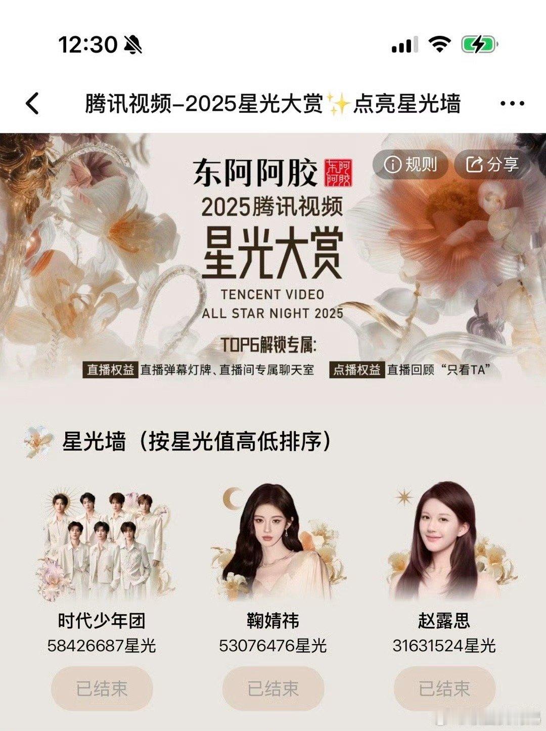星光大赏星光值TOP3尘埃落定,时代少年团凭高人气断层领跑,鞠婧祎冷艳造型与粉丝给力支持稳居前列,赵露思靠爆款作品与海外高热度强势入围。三场实力与人气的双向奔赴,每一份认可都实至名归!