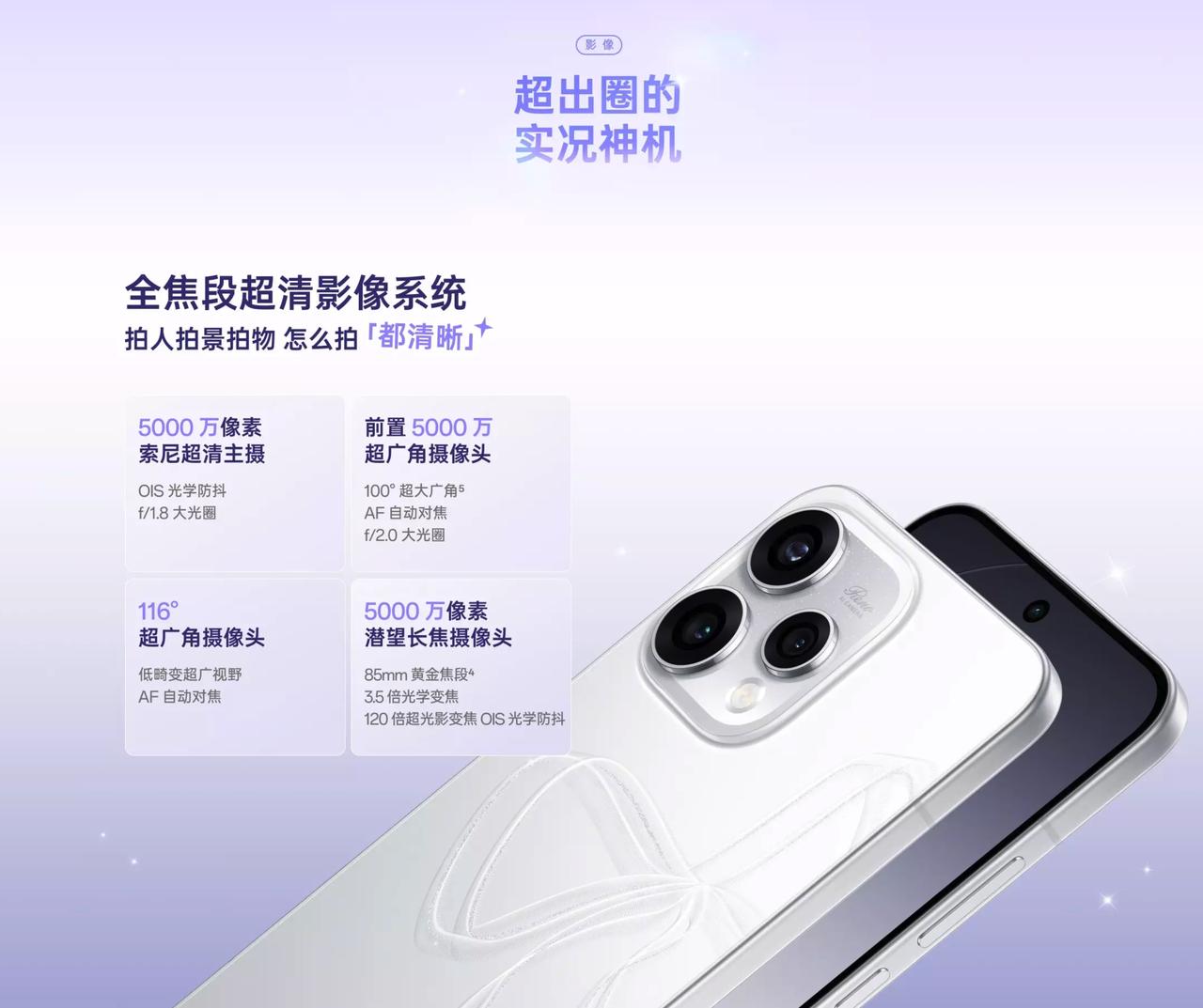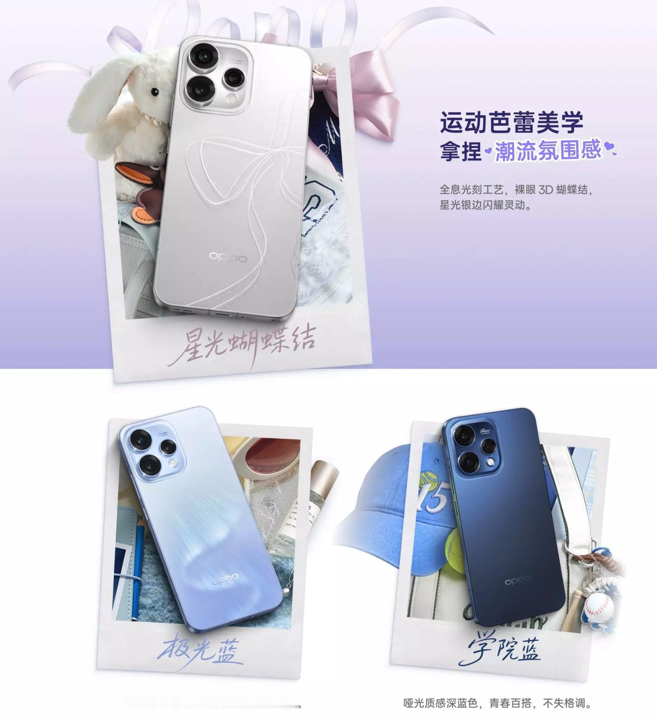OPPO Reno15c 上架全款预订(PMD110),19 号陆续发货。12+256GB 售价 2899 元、12+512GB 售价 3199 元,比 Reno15 标准版便宜 100 元,感觉怎么样?[吐舌] - 芯片:骁龙 7 Gen 4 处理器,LPDDR5X 内存,UFS 3.1 闪存,纳米冰晶散热; - 屏幕:6.59 英寸 2760×1256 OLED 直屏,手动最高亮度 600nits,全屏激发 1200nits,120Hz 刷新率,最高 240Hz 触控采样率,支持 10bit 色深,3840Hz 高频 PWM 调光; - 相机:前置 50MP,后置 50MP 主摄(索尼 CIS,两轴 OIS)+ 8MP 超广角 + 50MP 潜望长焦(OIS)三摄; - 续航:6500mAh 电池,支持 80W 快充(兼容 80W UFCS); - 其他:厚 7.77mm(极光蓝 7.89mm),重 197g,星光蝴蝶结、极光蓝、学院蓝 3 款配色,玻璃后盖金属中框,支持 Wi-Fi 6、USB 2.0、NFC、短焦光学指纹,支持 IP66 & IP68 & IP69 防尘防水,ColorOS 16 系统。