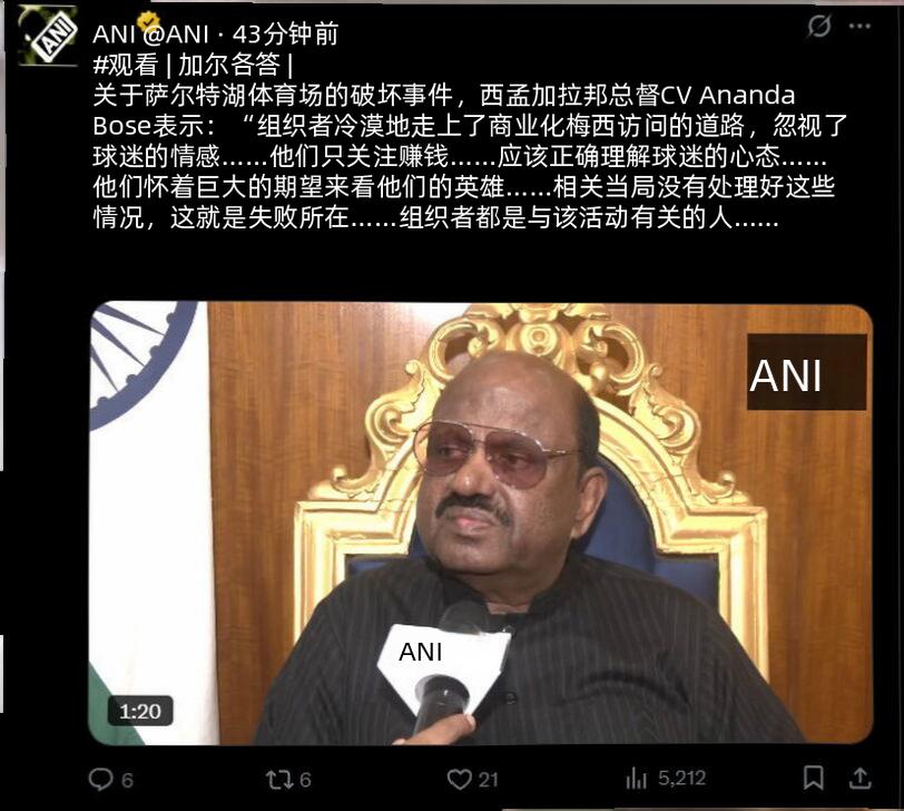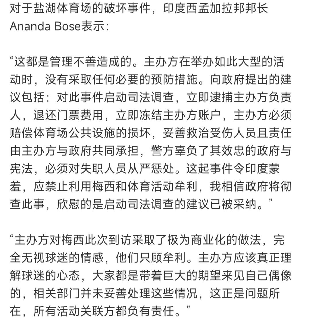 阿三的便宜是占不得的,占了是要吃亏的。 12月13日,印度男子花了12000卢比(约934元人民币),在加尔各答盐湖只看到了众政客和安保人员簇拥着的梅西的一个背影。球迷说梅西只出场10分钟,警方说出场20-22分钟,还都在人群中。士可忍孰不可忍,阿三愤而撸走了体育场的垫子,拿回家压压惊,消消气。 西孟加拉邦首席部长表示,将要求主办方退钱。 说归说,闹归闹,阿三官员这个态度和效率确实让人刮目相看,情绪价值这块是给的满满的。但有没有执行下去,是另外一回事。毕竟,他们出尔反尔是常事。 事发后,梅西在印度的另两场活动,照样进行。 梅西在香港的那次之行,和这差不多。梅西只是招财招牌,不是必出牌。