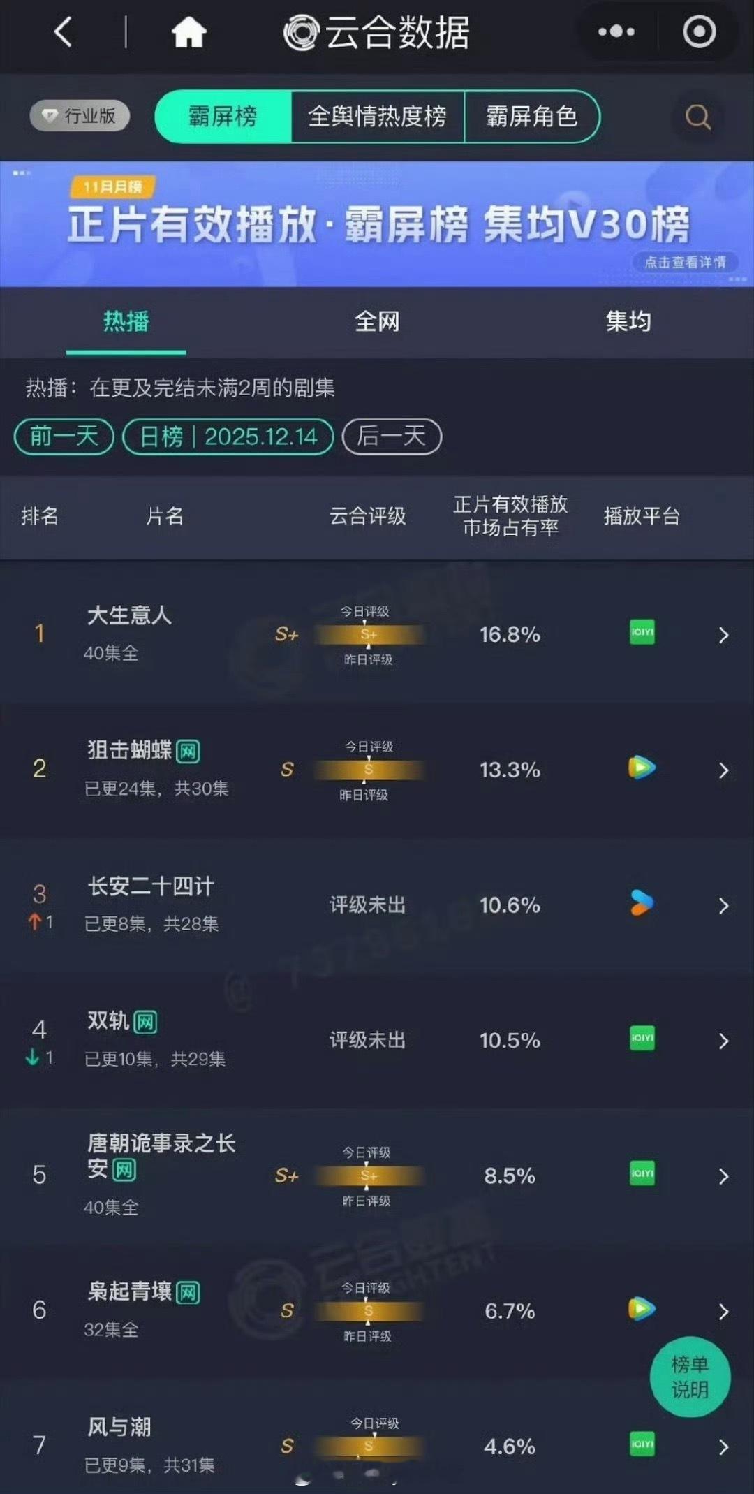 昨天的云合数据出炉,成毅的《长安二十四计》排名上升,虞书欣的《双轨》排名下降,大家都看了吗?
