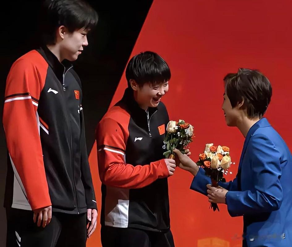 师姐跟师妹说了啥,莎宝难得这么畅怀大笑,这种发自内腑的笑,还是第一次领略,好像所有的压力和伤痛都释放掉了。张怡宁上台给莎莎献花,安抚莎莎的样子好美,四十多岁的她成熟,风韵犹存,面对小师妹的伤情,抓住几秒内的时间,就暖了师妹的心,不愧是冠军对冠军,个中的安慰和鼓励,只有他们自己秒懂,瞬间领会感受的到,师姐的一句话暖成莎宝心里的热炉。都是好样的,加油,莎宝。