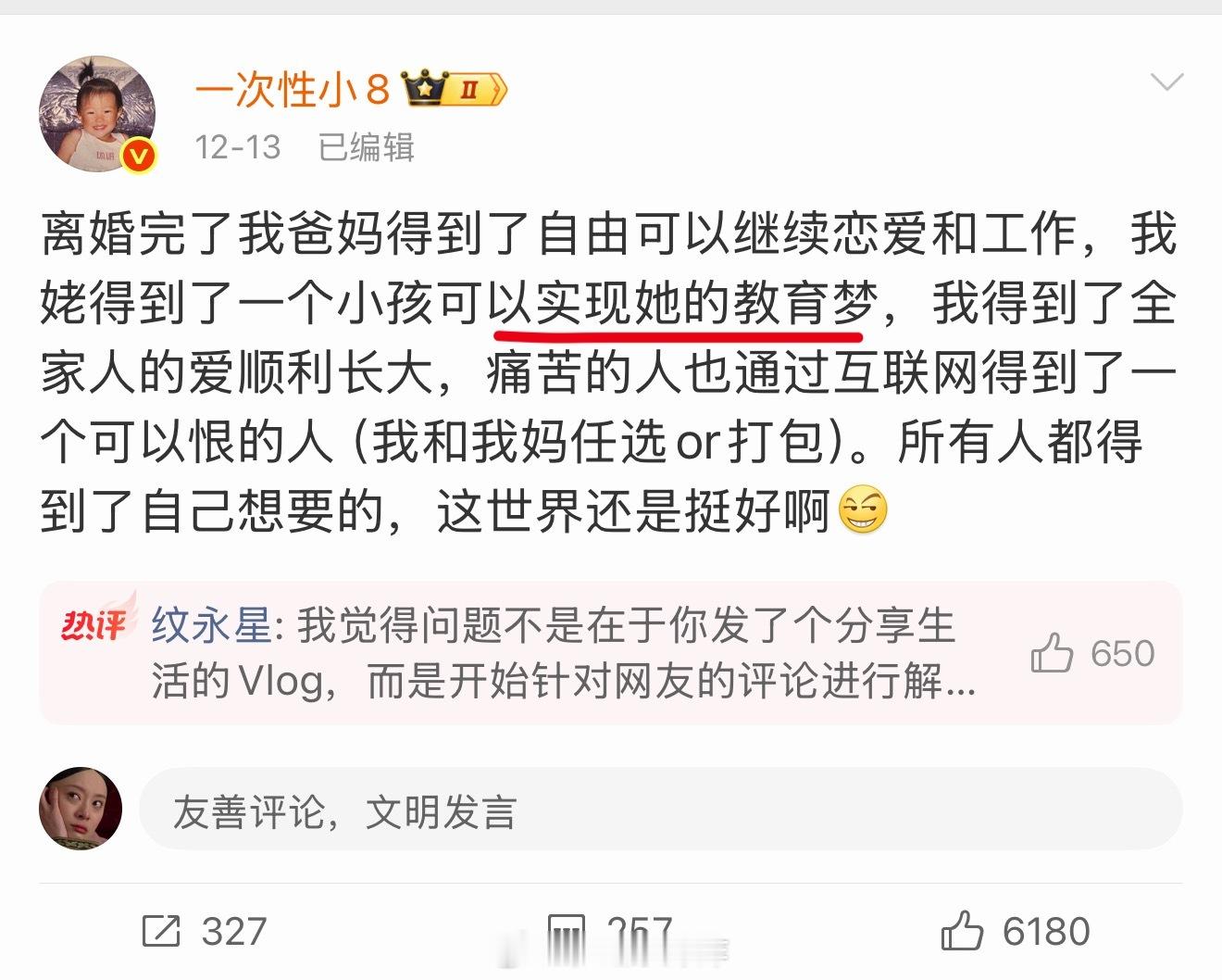 王悦伊和她妈,这俩人爱好不好,懒得讲她觉得她妈很爱她就爱吧毕竟人也不能抱着恨意过一辈子我只是很替那位姥姥抱不平养了一个不靠谱的女儿又养了一个不记恩情的白眼狼姥姥抚养她长大,她说自己是实践教育梦的“工具”姥姥照料她吃喝,她说自己“回馈”了陪伴在她眼中,姥姥是一个自讨苦吃、嫉妒女儿的局限女性不管她的妈妈,则是尊重、信任、爱护的好家长她认为爱可以被替代母爱就这样被姥姥的爱替代了那么是不是说明,姥姥的爱也可以被替代她到底明白什么是爱吗爱这样诚挚的感情,在她口中像商品一样,随时更新换代?王悦伊回应