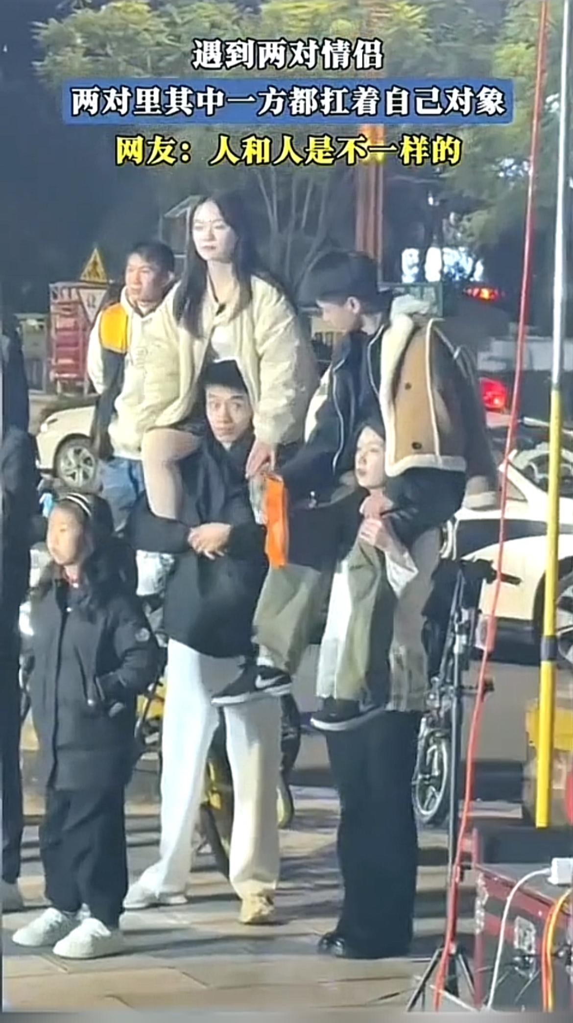 两对情侣的甜蜜时刻,惹得网友感慨:人跟人果然有别!一对情侣中,老婆坐在老公肩膀上;另一对情侣则是老公坐在老婆肩膀上一同观看节目,着实令人感叹。