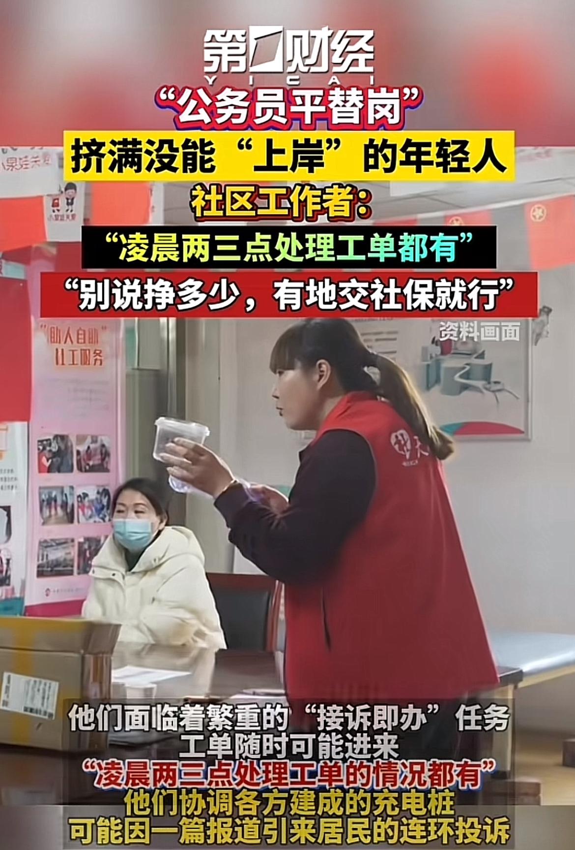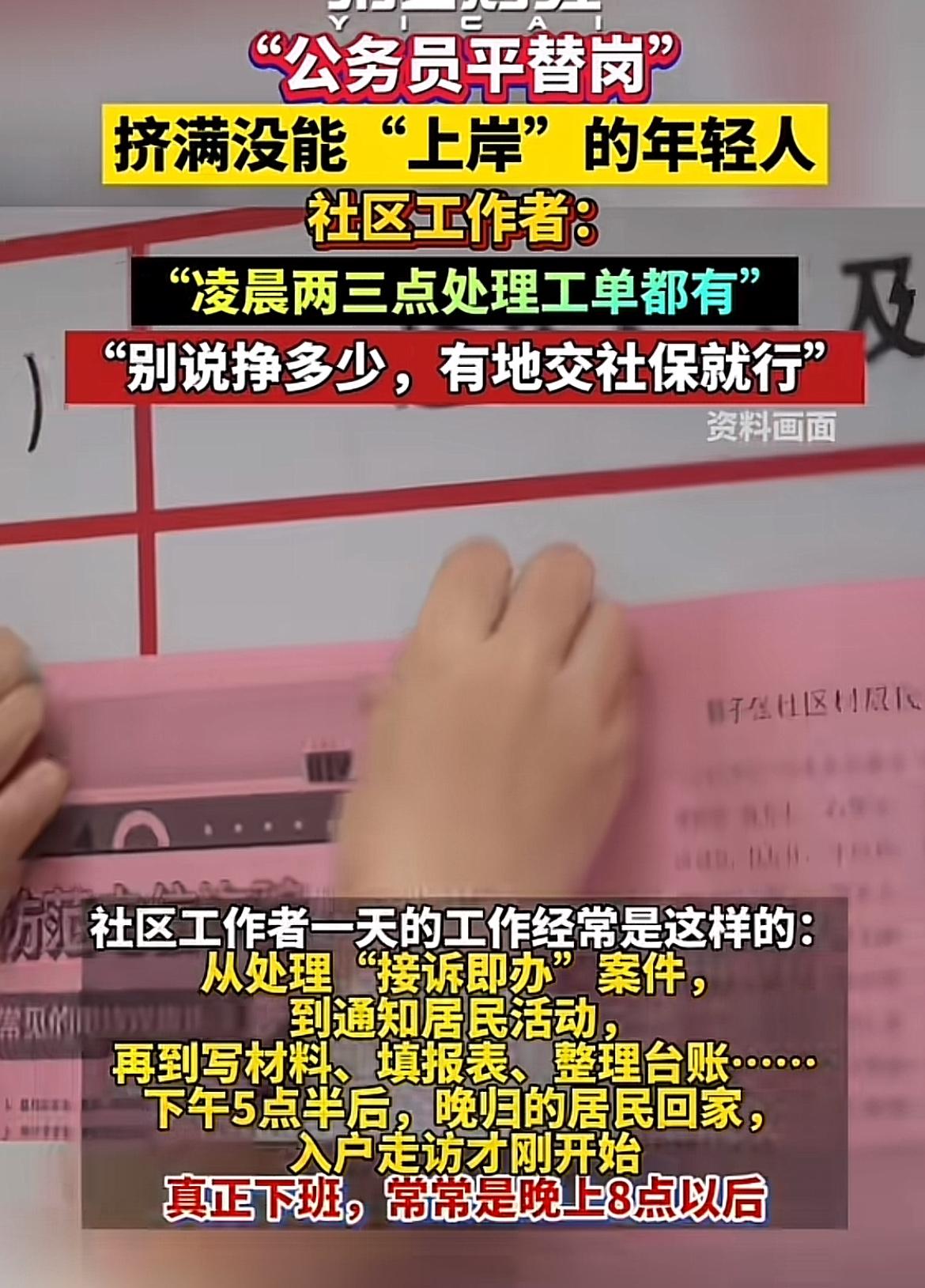 现在好多没能力“上岸”的年轻人都盯上了公务员平替岗,像社区工作岗就挤满了人。可这社区工作压力大得离谱。就说疫情那会,社区工作人员天天忙得脚不沾地,排查人员、分发物资,累得要死。平时呢,各种琐事也一堆,调解邻里纠纷、统计居民信息,一天下来忙得晕头转向。而且工资也不高,和付出完全不成正比。那些冲着“平替”来的年轻人,以为能轻松点,结果进去才发现是个大坑。本想找个安稳工作,没想到压力这么大,真是有苦说不出。