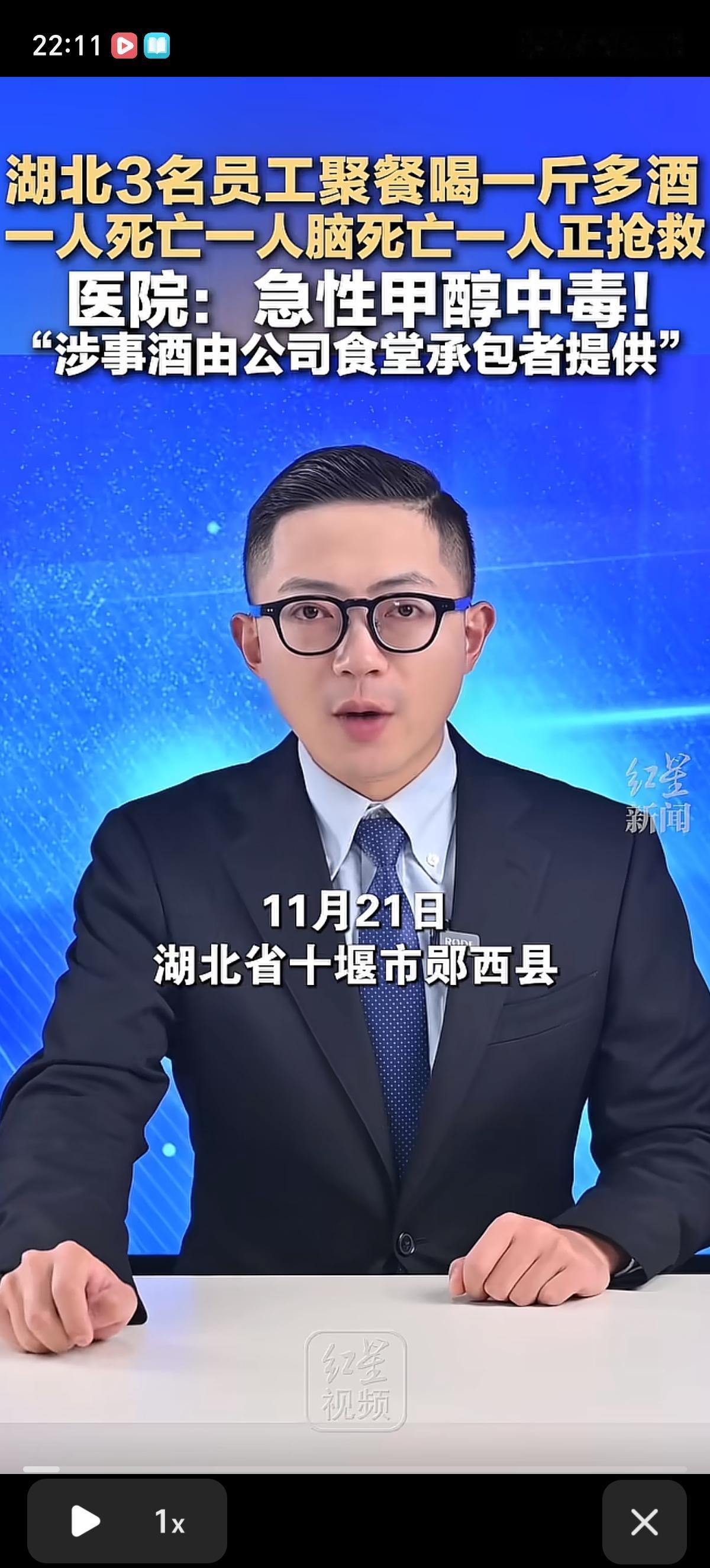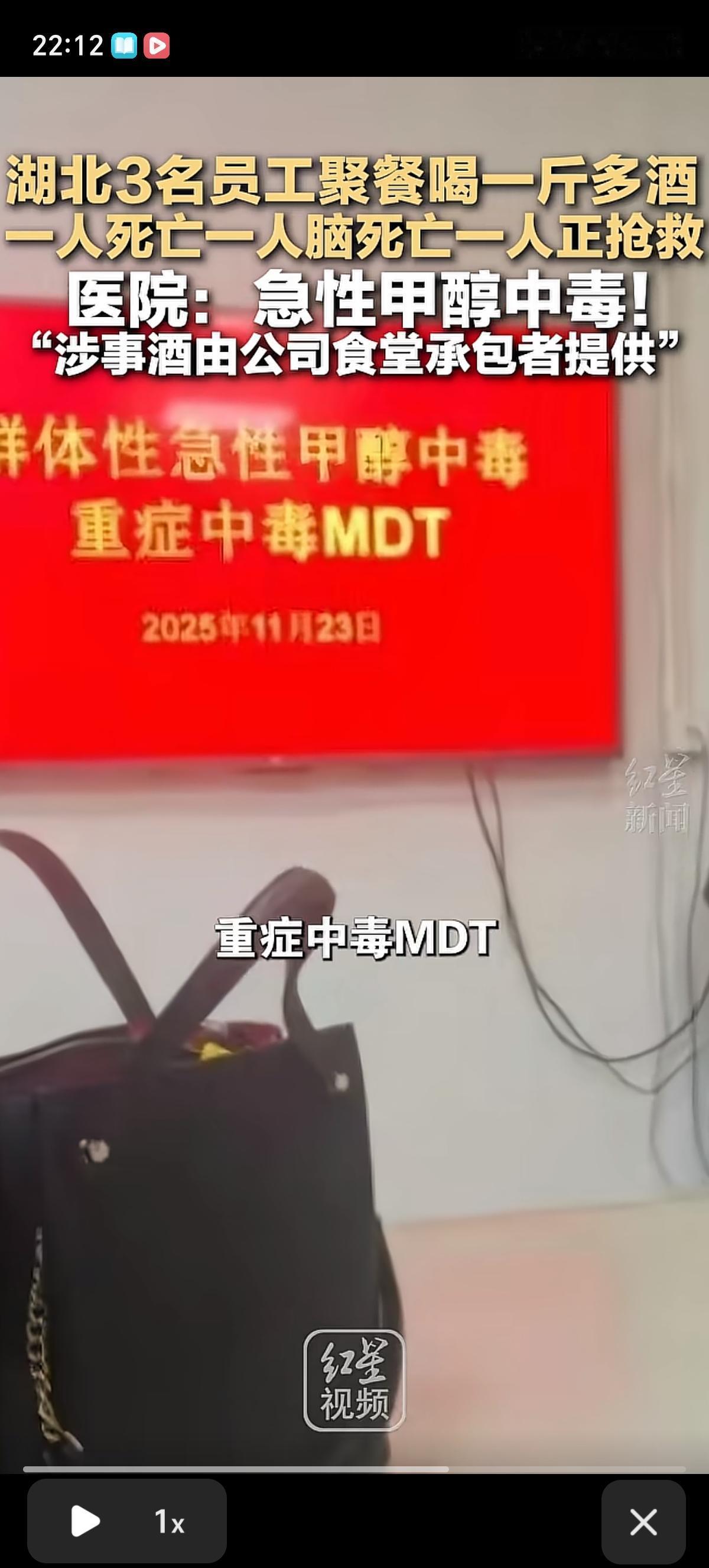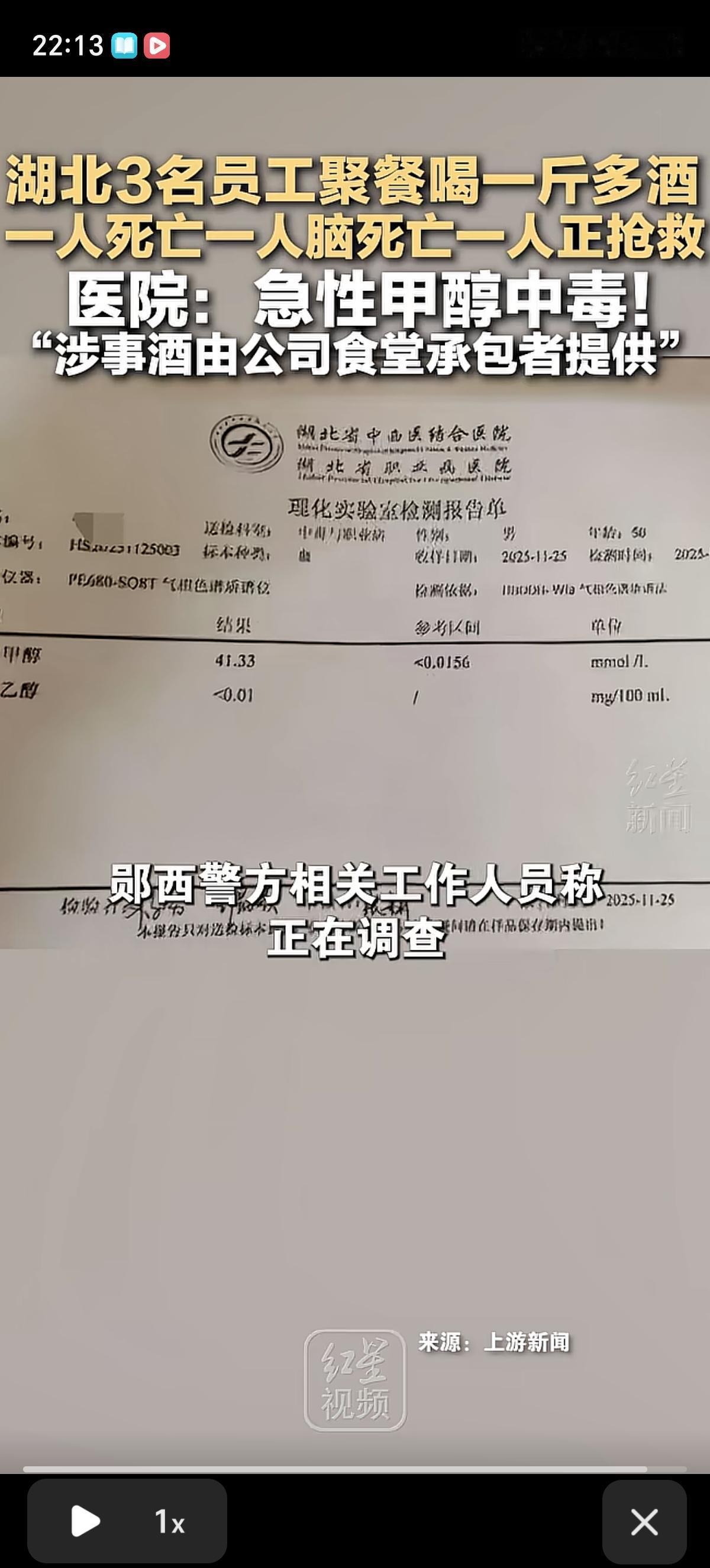 一斤多散装白酒,3个人,一人死亡、一人脑死亡、一人正在抢救。湖北十堰郧西县神风实业有限公司3名男员工加班后饮用了从公司食堂拿的、用饮料瓶装的一斤多散装酒,就这样了。 5个人吃饭,3个人喝了酒,都躺下了。都是急性甲醇中毒,剩下俩人完好,真是幸运儿! 这事是公司食堂的胡师傅把工业酒精(本来是炊具燃料)当成白酒,拿给了聚餐的员工,才导致三人甲醇中毒的。 现在胡师傅已经被采取强制措施了,涉事公司先垫付了40多万的医药费,当地多个部门也还在继续深入调查处理这事儿,后续结果还得等通报。
