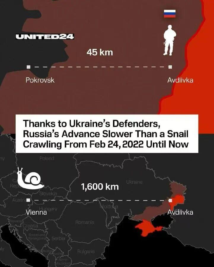 United24发表对乌克兰的感谢。 感谢乌克兰人抵御俄罗斯推进,让俄罗斯人只前进到顿巴斯,如果在2022年2月24日在阿夫迪夫卡放一只蜗牛,到今天它已经可以爬到维也纳了。