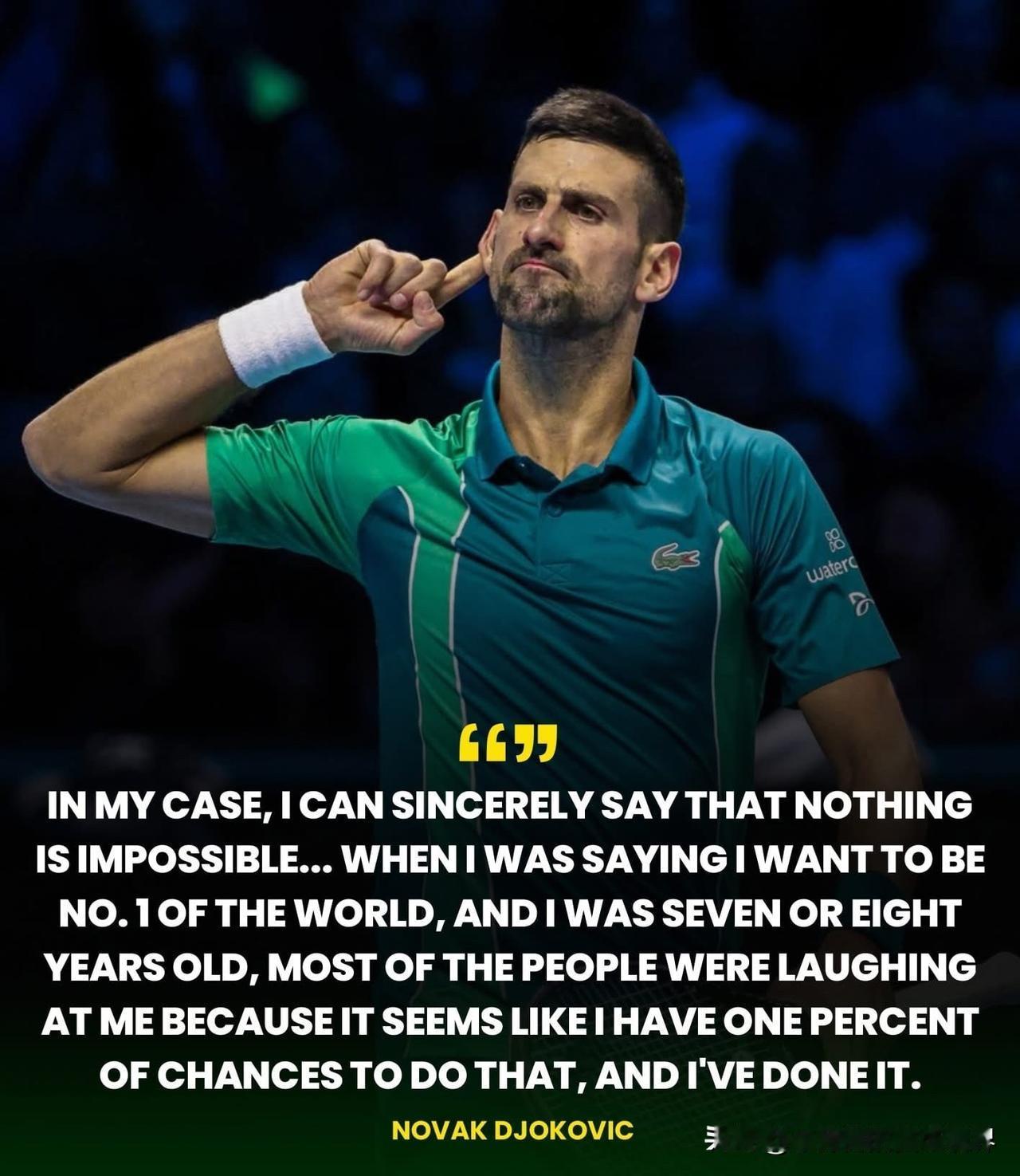 回顾德约科维奇的经典语录:没有什么是不可能的! 他说:“就我而言,我可以真诚地说,没有什么是不可能的。当我七八岁的时候说我想成为世界第一时,大多数人都嘲笑我。我觉得自己只有百分之一的机会,但我最终还是做到了。” 信念先于结果,愿景先于认可。 正是这种心态造就了今天的德约科维奇。