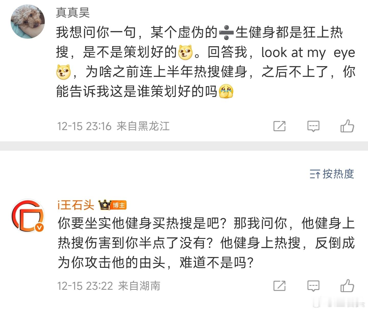 别人健身上热搜并没有伤害到你,别人健身上热搜明明是正向、积极的形象。我之前也分享过雷总健身对我的影响,你相信一个人能给你带来影响,那你就去积极改变自己,你不相信那也没事,他上他的热搜,你做你的自己,他并没有伤害你,而你却因为他健身上热搜而攻击他,我觉得做人还是要讲点道理。