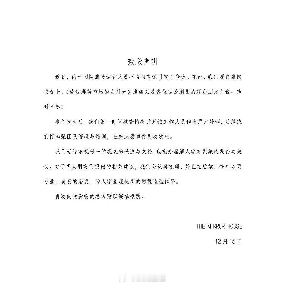 我看了一下,致我那菜市场的白月光剧组造型团队主要针对工作人员的不当言论致歉。只说了会听取大家的建议,没说改进,只有态度,没有行动,其实就是安抚人心的话术。也可能以他们专业的眼光来看,确实不存在问题。