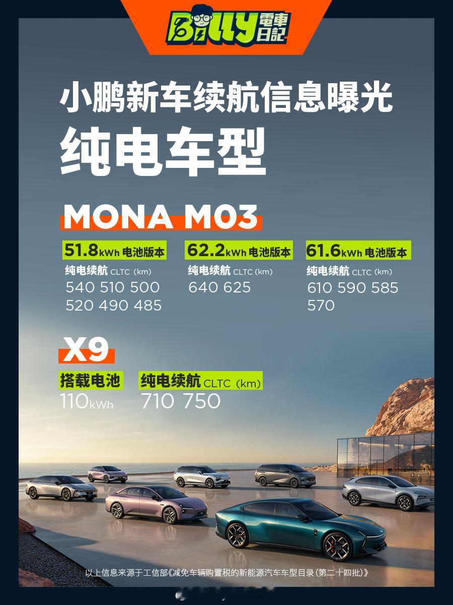 今晚工信部最新披露的信息里剧透了小鹏多款车型续航信息,做个图给大家汇总一下!除了大家关心的G6和P7+超级增程之外,还有MONA和X9纯电!大v聊车