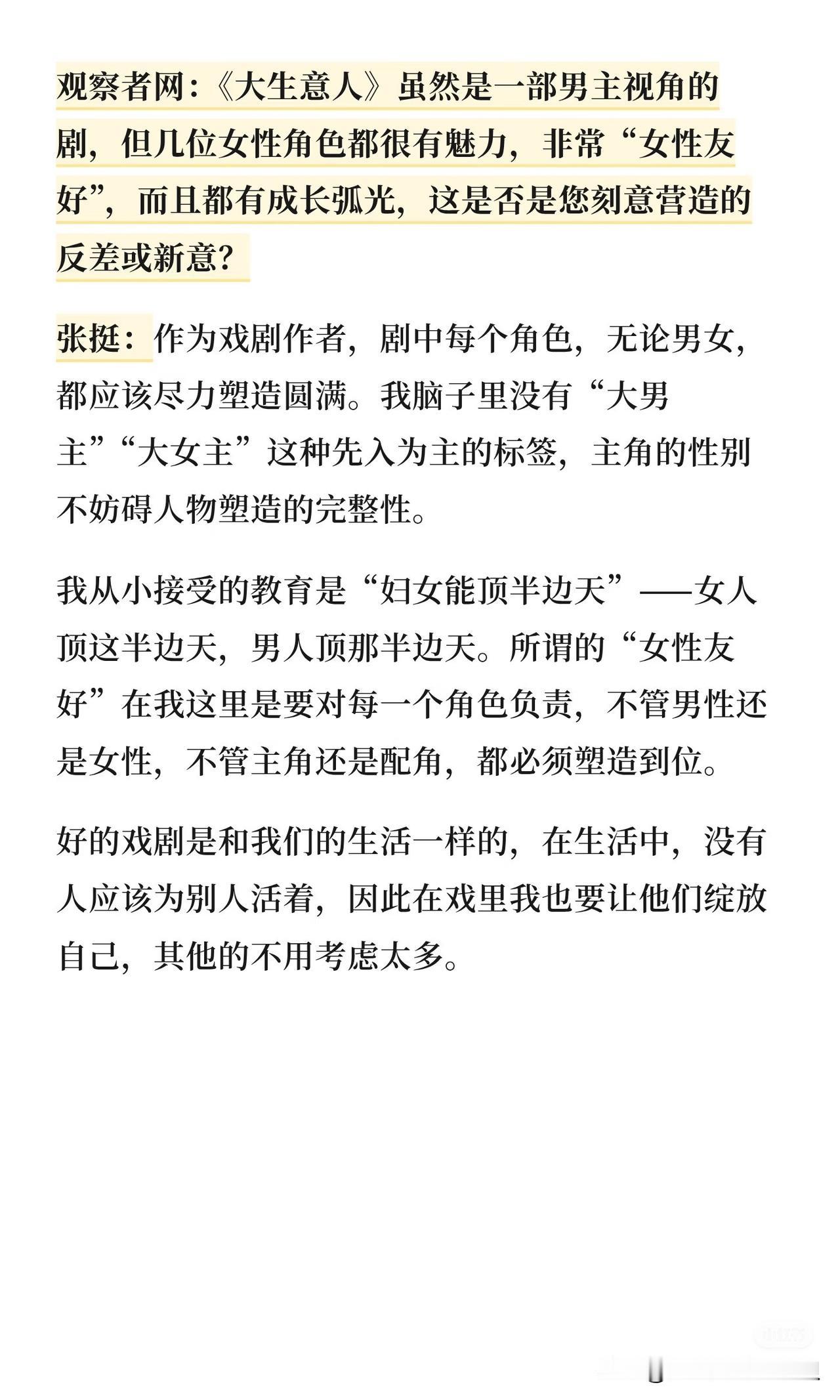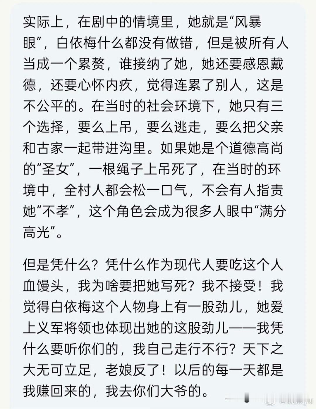 张挺导演🈶这样的格局,难怪能写出那么多好作品。 最新的采访中,他谈到了「大生意人」中最有争议的一个角色——白依梅。 按照一些网友的观点,白依梅从李成那里回到村里后,成了村民和古平原的「累赘」 虽然古嘴上说不在乎,但不代表他娘不在乎,他家族不在乎。 所以白依梅应该选择“死亡”来成就角色的满分高光人设。 但是凭什么呀?她为什么要牺牲自己来满足剧里剧外这些人的自私想法?她的人生应该由她做主!