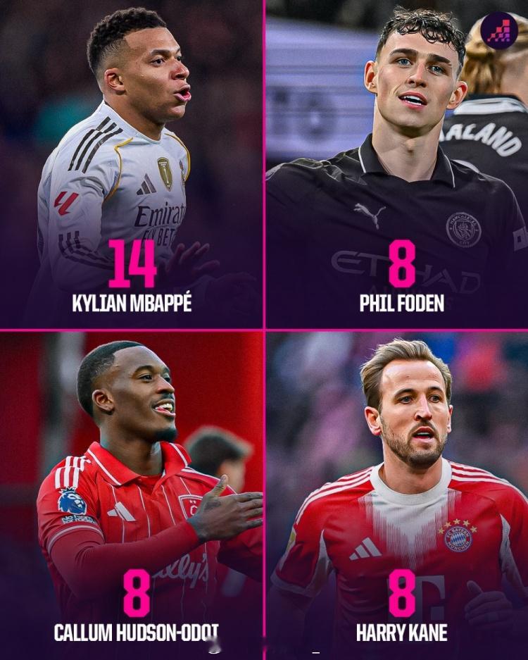2023-2024赛季以来五大联赛禁区外进球榜(仅统计联赛):姆巴佩——14福登——8奥多伊——8凯恩——8