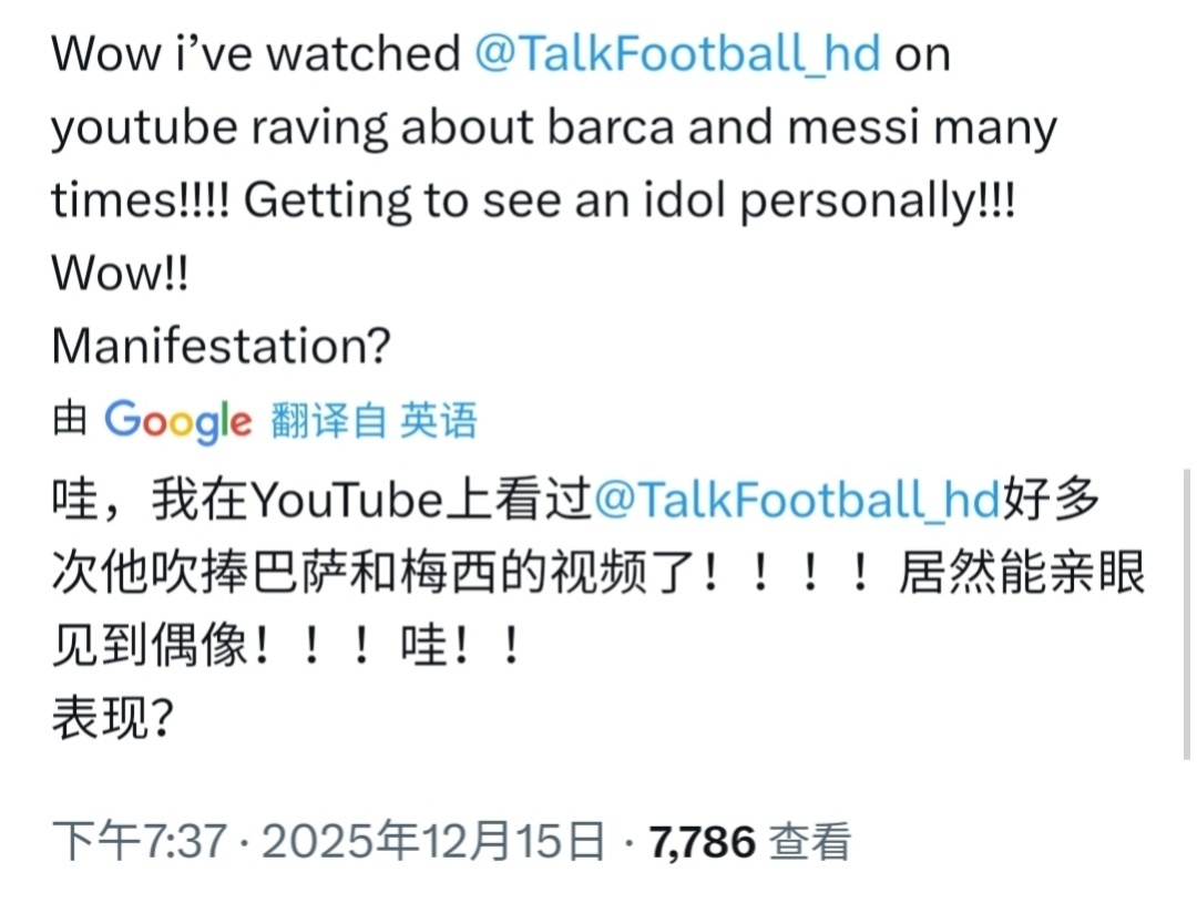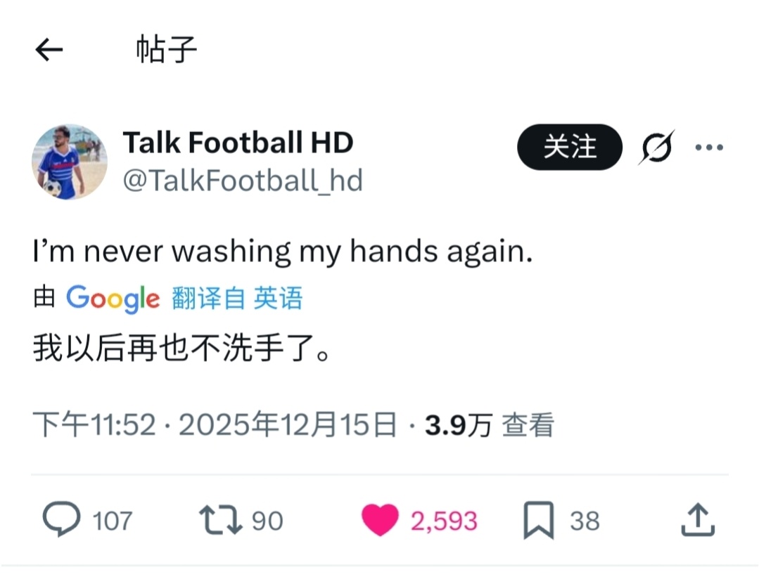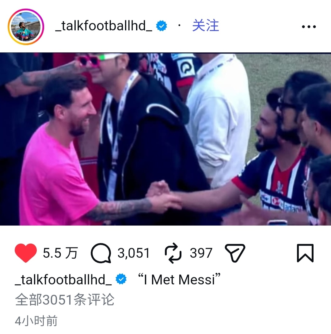 一位Youtube网红成功握到了梅西的手🤝,发推表示“我以后再也不洗手了”