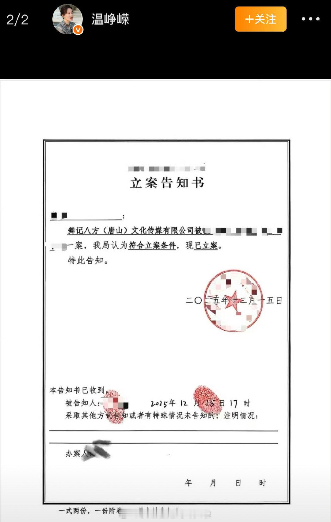 温峥嵘告了说她“卖面膜出事把锅推给ai”的人,晒了《立案告知书》温峥嵘称已刑事立