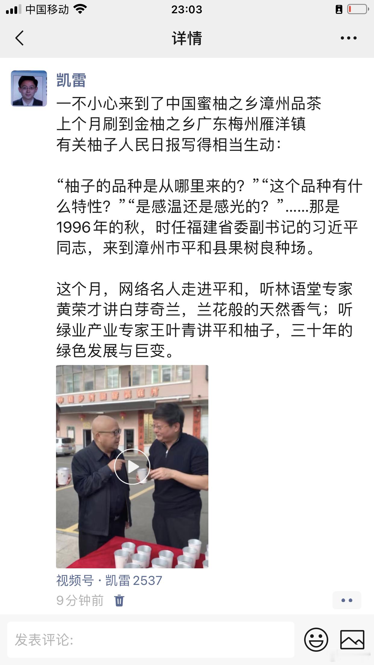 一不小心来到了中国蜜柚之乡漳州品茶上个月刷到金柚之乡广东梅州雁洋镇有关柚子人民日报写得相当生动: “柚子的品种是从哪里来的?”“这个品种有什么特性?”“是感温还是感光的?”……那是1996年的秋,时任福建省委副书记的习近平同志,来到漳州市平和县果树良种场。 这个月,网络名人走进平和,听林语堂专家黄荣才讲白芽奇兰,兰花般的天然香气;听绿色产业专家王叶青讲平和柚子,三十年的绿色发展与巨变,涉柚产业超百亿,真的是1996年勾勒出的柚子图景都一一实现! 网络名人看福建 新质福建万千气象
