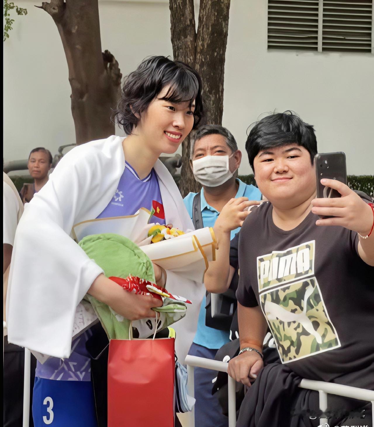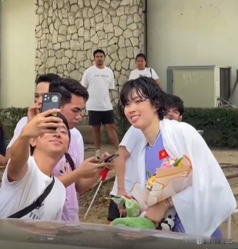 号称越南“小朱婷”的陈氏青翠,在泰国人气挺旺的[呲牙] 瞧,在曼谷大街的陈氏青翠,被泰国球迷围堵了。看看这位“小朱婷”多受欢迎,粉丝们为她送上鲜花、毛绒玩具、红色礼品等。接着粉丝争先恐后要与她合影,她都表现得极为亲切和诚恳。 长期在海外留洋的陈氏青翠,球技得到大幅度提升和锻炼。昨天决赛没有她的精彩发挥,越南女排不可能与泰国女排打到第五局。这就是一个球星的价值!