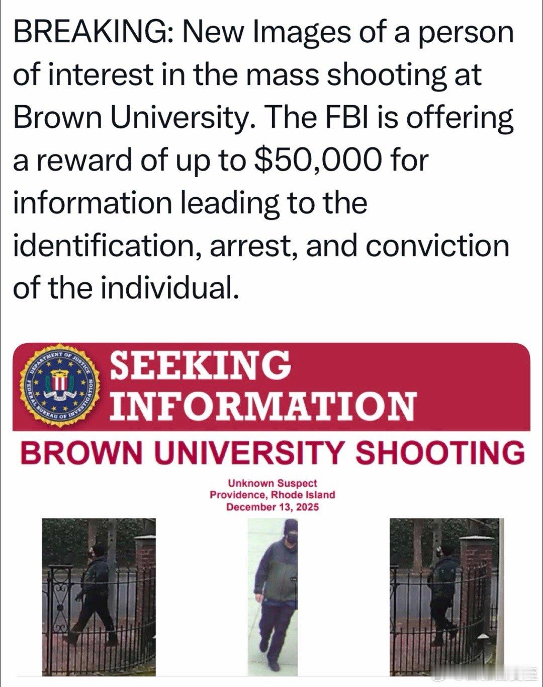 布朗大学枪击案嫌疑人还没有抓到FBI公布新图片、悬赏五万美元、请求公众提供线索热线☎️1-800-CALL-FBI