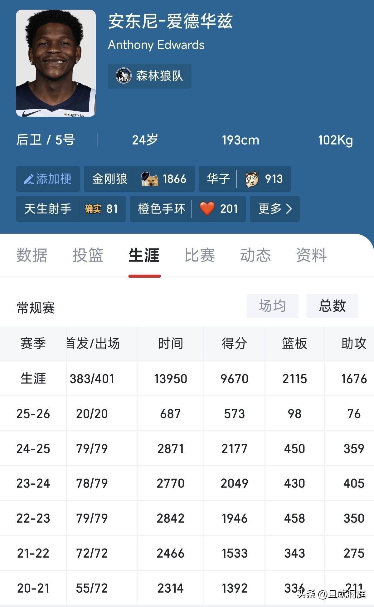 距离10000分还差330分,本赛季已经缺席六场了,前五个赛季出勤率比较高,本赛季是第六个赛季了!爱德华兹有机会超过东契奇比肩詹姆斯的得分,前提是不要受伤病影响,本赛季场均28.7分创生涯新高,还有很大提升空间,还是有机会成为现役前五球星的。
