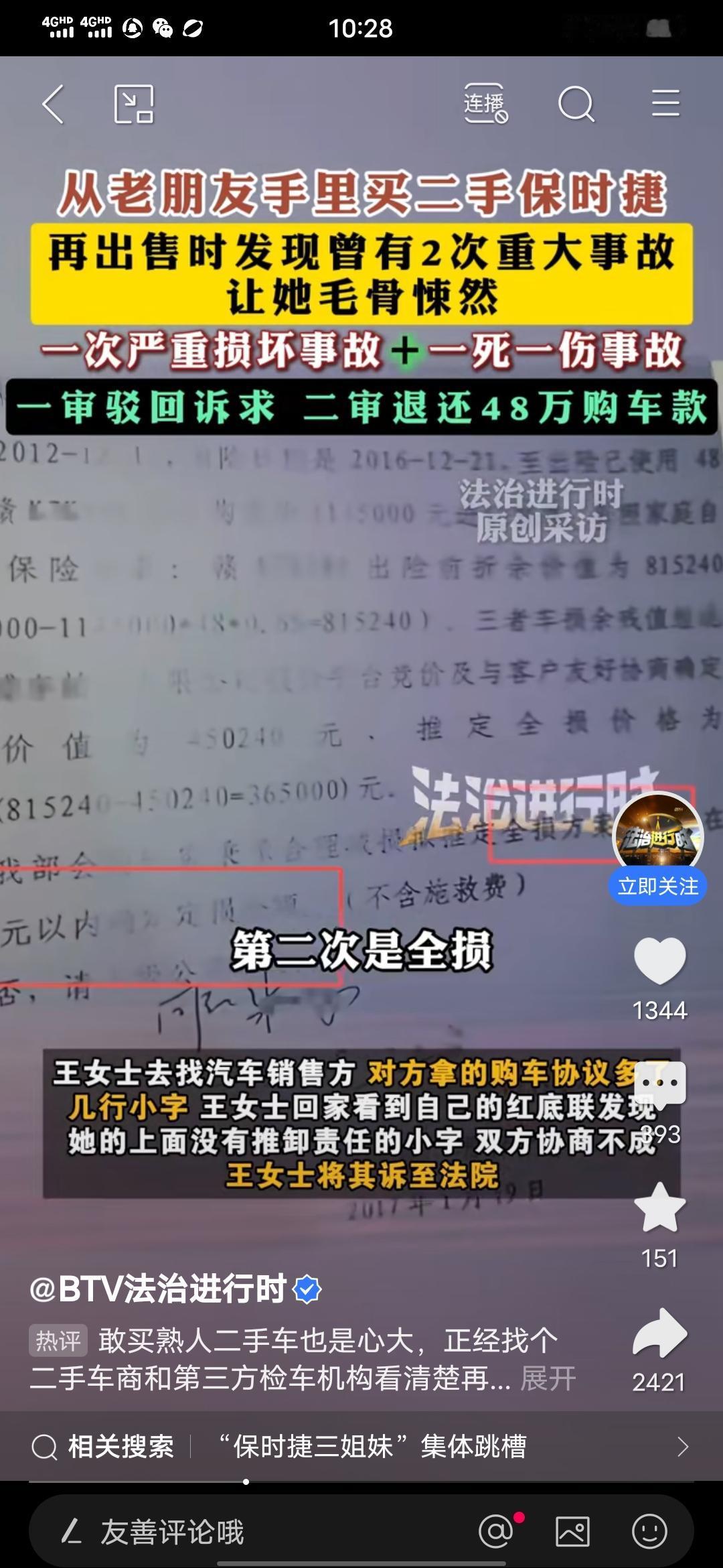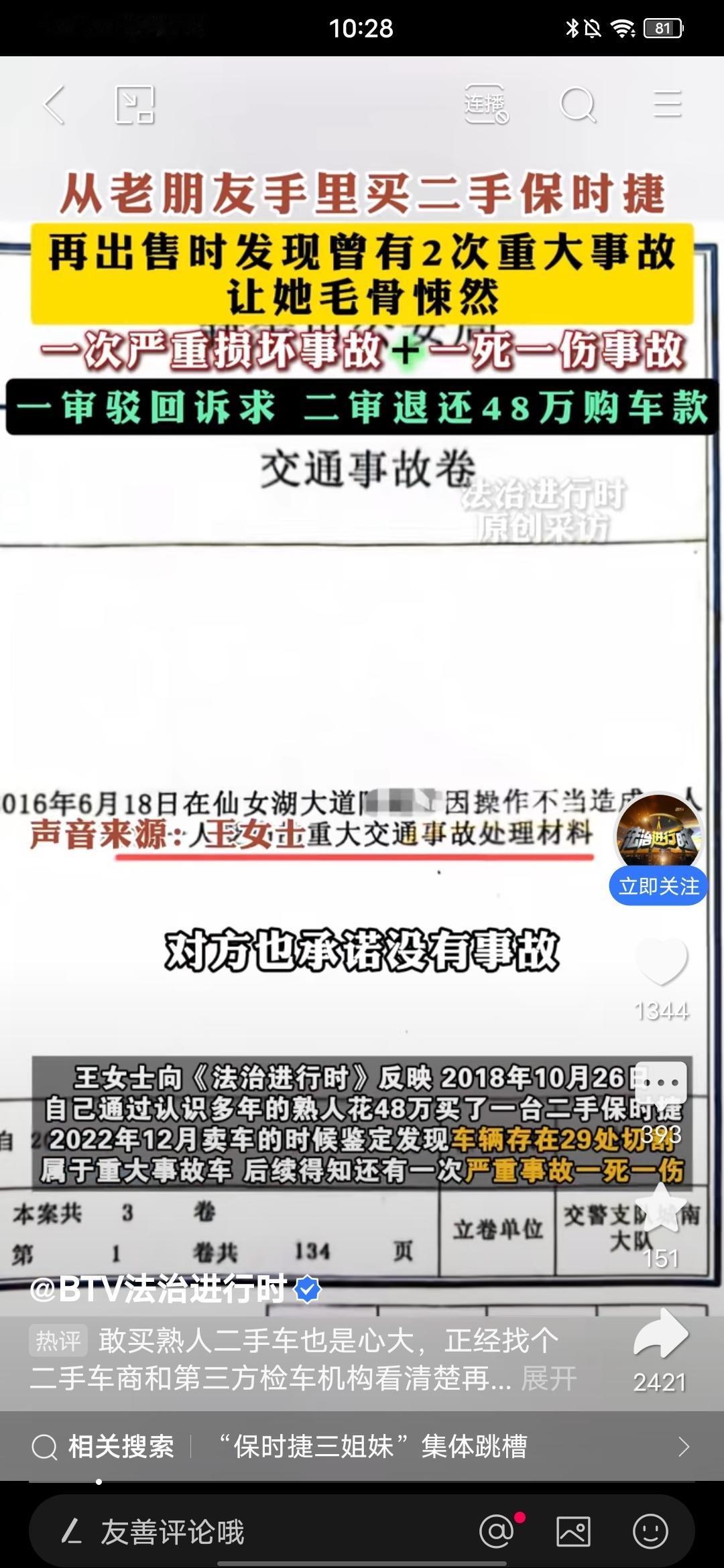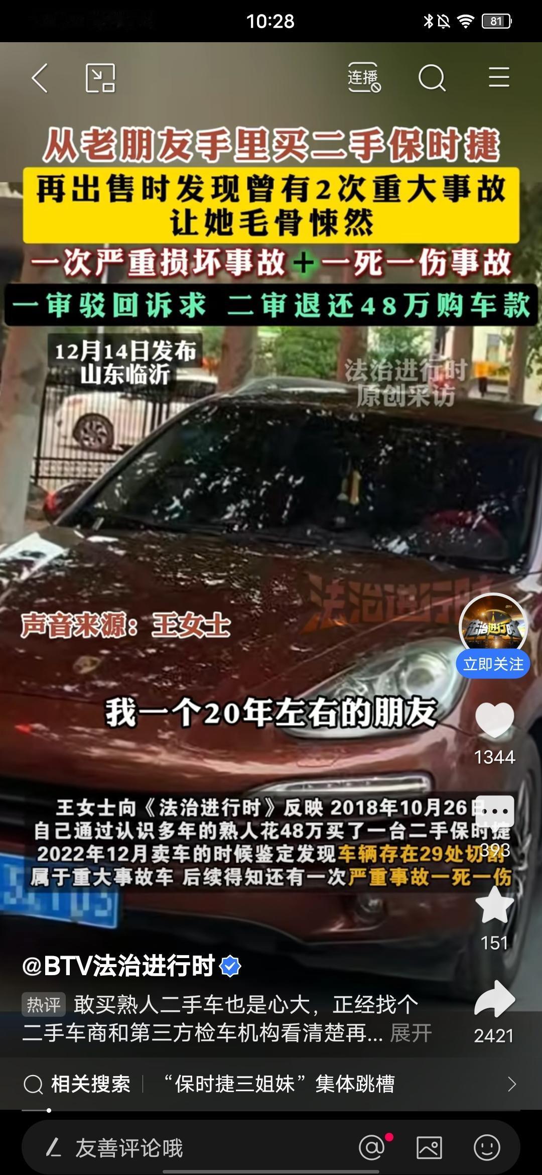 女子从20年老友手里花48万买二手保时捷,再出售时让她毛骨悚然,朋友被判退还48万购车款! 刚在法治进行时平台看到的这则消息,山东临沂的王女士,从20年的老朋友手里花48万买了一辆二手保时捷,买的时候对方承诺没有事故,没有调表,后面过了四年王女士打算卖掉这辆车时,二手车收售方发现这车有过两次重大事故,一次一死一伤,第二次是全损。 随后,王女士去找老友退款,对方拿出的合同和自己手里的合同还有区别,对方的合同还多了几行小字。后来协商不成王女士只好起诉对方了,一审驳回诉求,二审判全额退款。 这就是所谓20年的老友?要真是朋友会干这样的事吗?可见,很多所谓的朋友实际并不是真正的朋友。 另外,王女士四年后才发现车有这么多问题?每年的保险是怎么买的?买没买?还有这种家用小车,每年都是要年检的,不可能检不出,是不是年检王女士也没有去做? 另外当初从朋友手里买过来,过户之前也是要检查鉴定的,她所谓全车29处切割,当时鉴定怎么过关的?有很多不合常理的地方哦! 不过有一点是很明确的,那就是买二手车一定要多留心,需要小心谨慎!把该弄清楚的一定要彻底用清楚,毕竟车这东西,会关系到自己和他人的安全,一定不能掉以轻心!