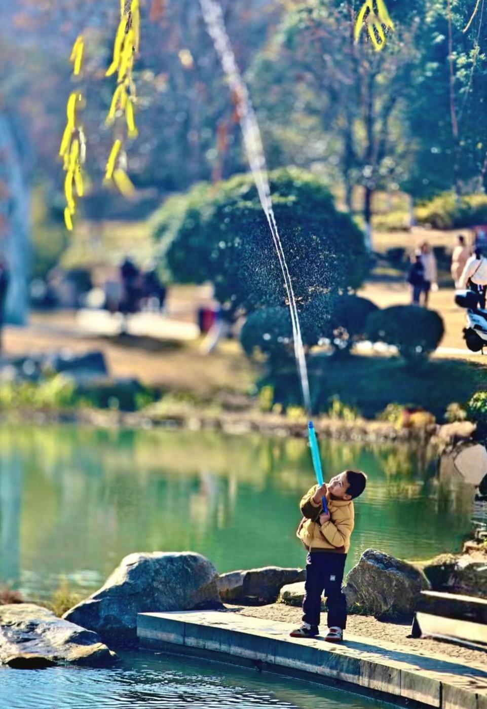 ✨湖畔的风偷藏了柳的絮语,孩子将水线抛成透明的虹,每一粒水珠都在阳光下,炸开童年的小确幸。 🍂柳丝坠着金黄的诗,孩子往蓝天泼洒碎银似的笑,湖水漾开的波纹里,盛着整个秋天的温柔与烂漫。