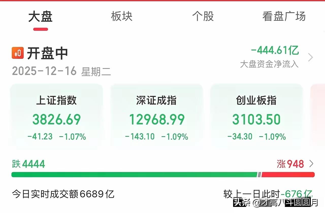 关于A股,一个好消息,一个坏消息 好消息是,市场缩量下跌的节奏放缓了,12月15日成交额降到1.77万亿元,比前一天少了3000多亿。卖压轻了点,指数在3860点附近晃悠,没继续往下破。 坏消息是,资金都在等方向。防御板块像保险、消费零售涨了点,科技股却跌得厉害,半导体和通信设备资金流出明显。这种分化说明市场情绪还是虚,没人敢带头冲。 我有预感,这次A股真的要变天了! 变天的关键,不是美股涨跌,也不是政策喊话,而是板块轮动彻底乱套了。 商业航天概念前几天还在炒,今天就有资金开始撤,冲高回落的票越来越多。消费板块偶尔动一下,也就是个防守动作,带不动整体人气。现在市场缺一条清晰的主线,资金像无头苍蝇,一会儿扑高股息,一会儿躲科技股,结果两头不讨好。 眼下最让人担心的是节奏 指数磨底的时候,最容易犯两种错:一是怕踏空急着追涨,二是怕套牢不敢动手。 老手们都在看两个信号:一是3860点能不能撑住,昨天低点3863点试探了一次,今天缩量算是个好迹象;二是量能能不能稳住,早盘半小时成交要是连800亿都站不住,反弹就难有指望。 你怎么看现在的市场?是等着反弹,还是已经空仓观望了? 晒图笔记大赛